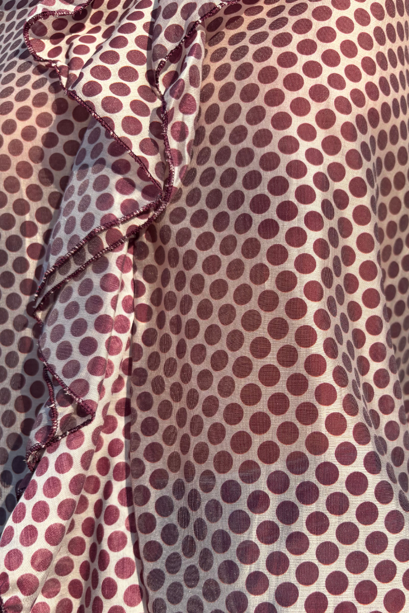 Made from a lightweight and fluid fabric, its design stands out with the ruffle on the chest, adjustable with a delicate bow that not only adds a romantic touch but also allows it to easily adapt to different body types and chest sizes.