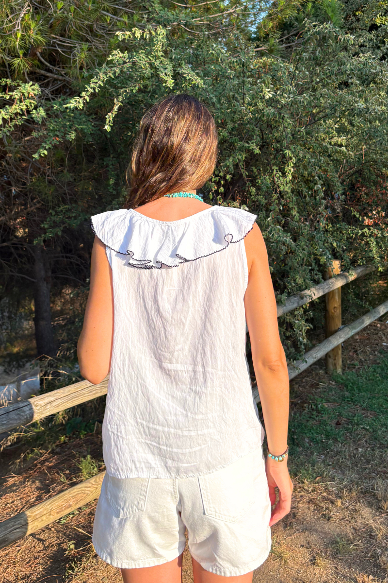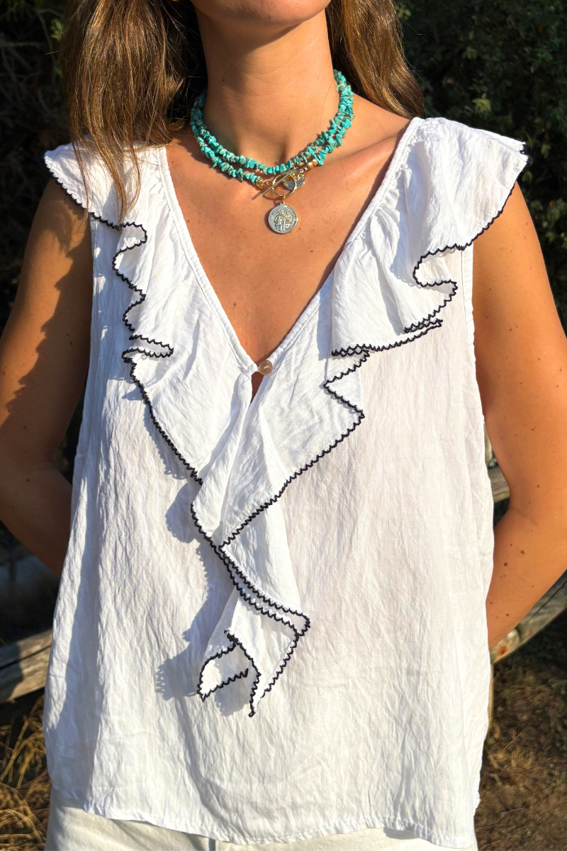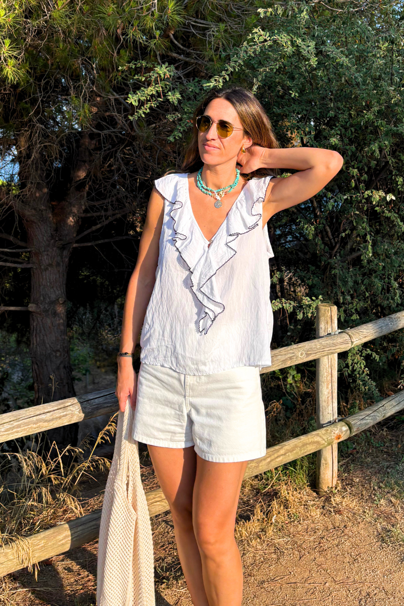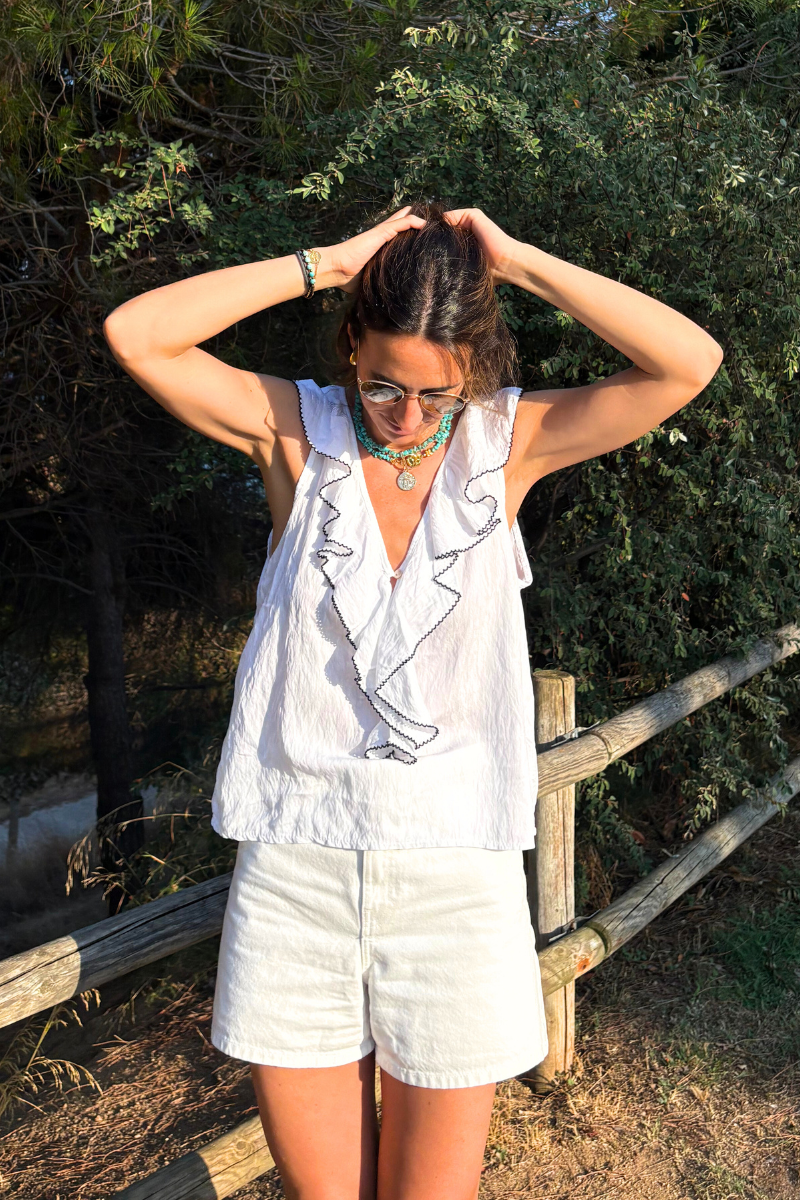 The Beni shirt is the perfect garment for this summer. Sleeveless and with delicate ruffles, it adds a feminine and flattering touch that enhances your style effortlessly.