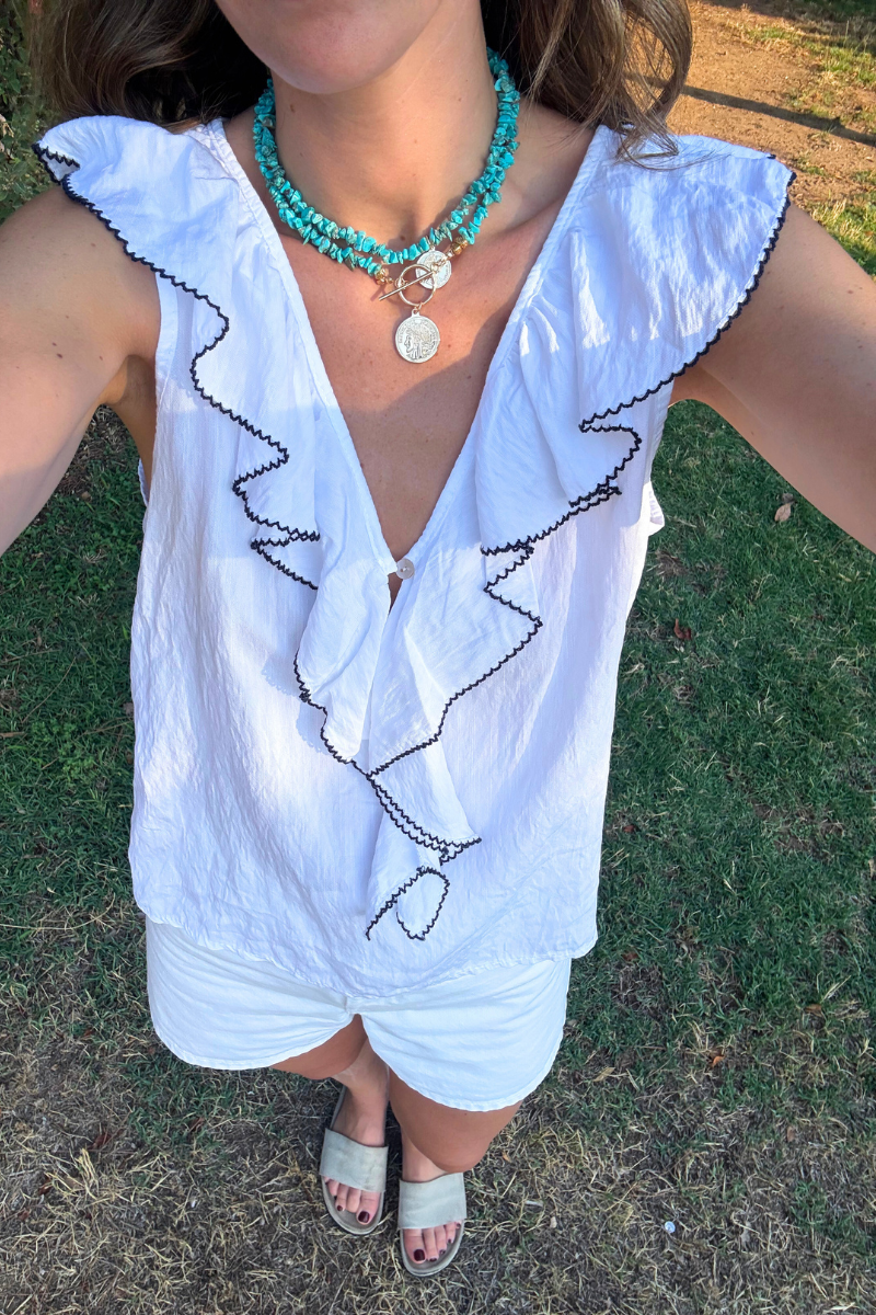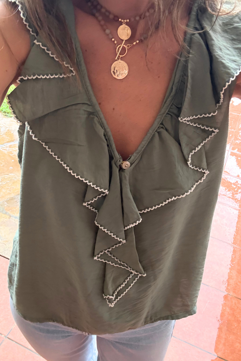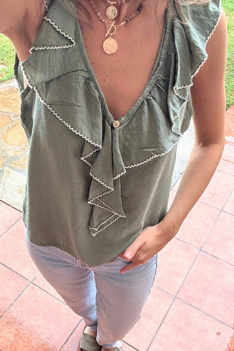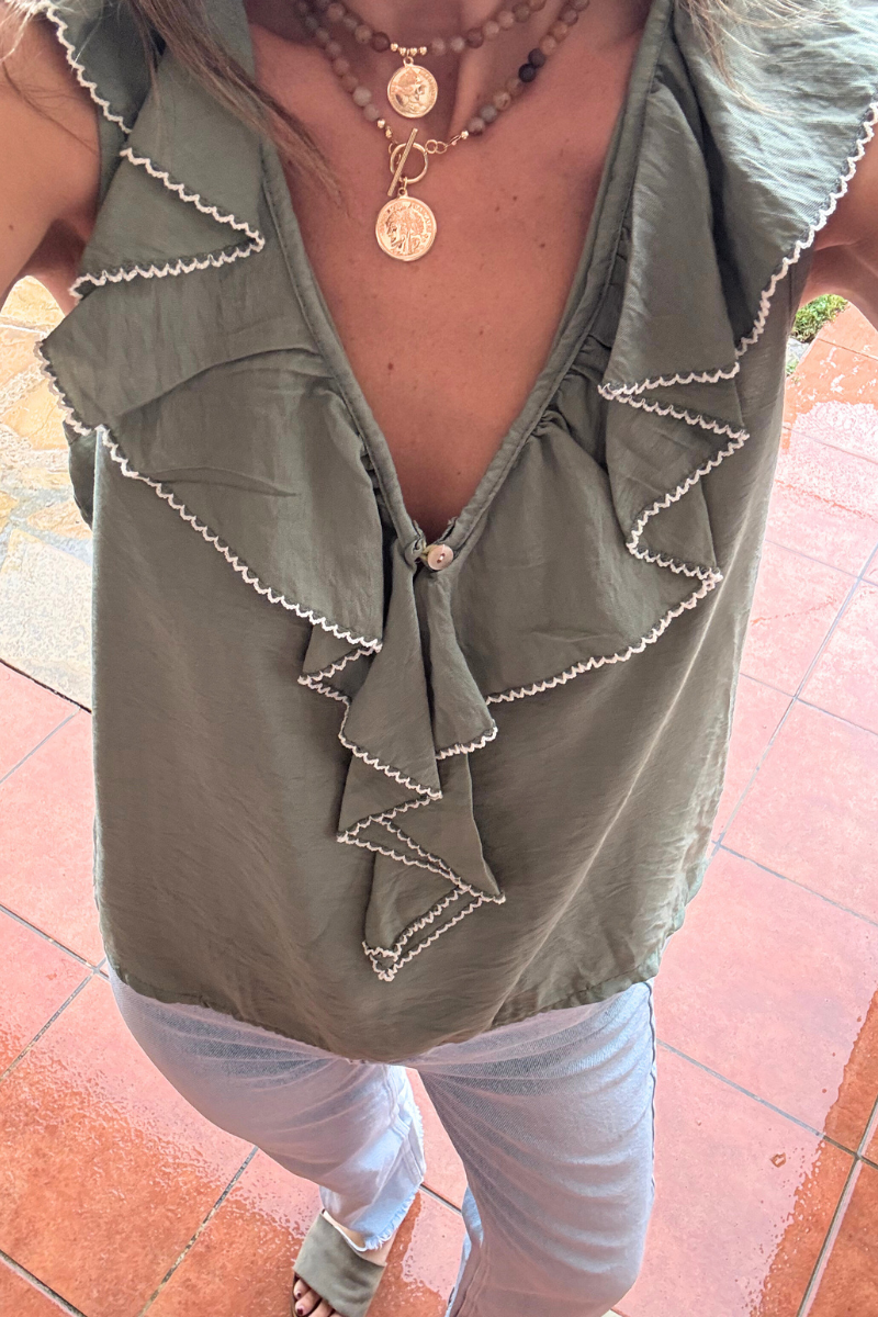 The Beni shirt is the perfect garment for this summer. Sleeveless and with delicate ruffles, it adds a feminine and flattering touch that enhances your style effortlessly.