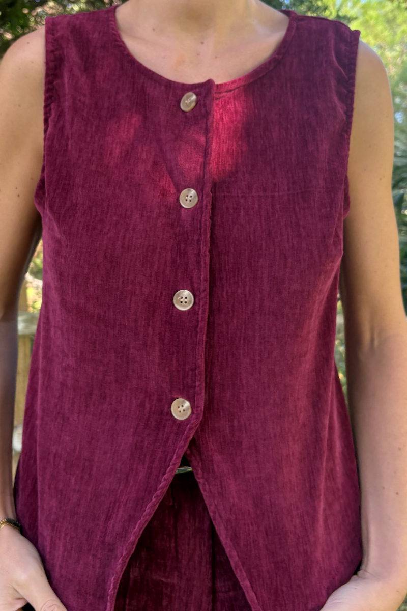 El chaleco Lamu está confeccionado en terciopelo, un tejido cómodo y con cuerpo que aporta textura y calidez. Presenta un corte recto, con cierres de botones delanteros de efecto madera y un acabado estructurado que favorece la silueta sin ajustar.