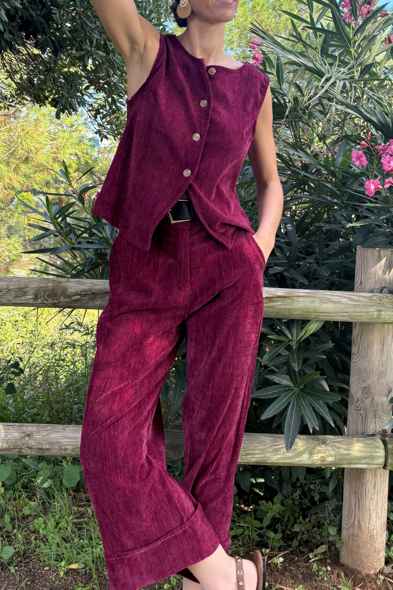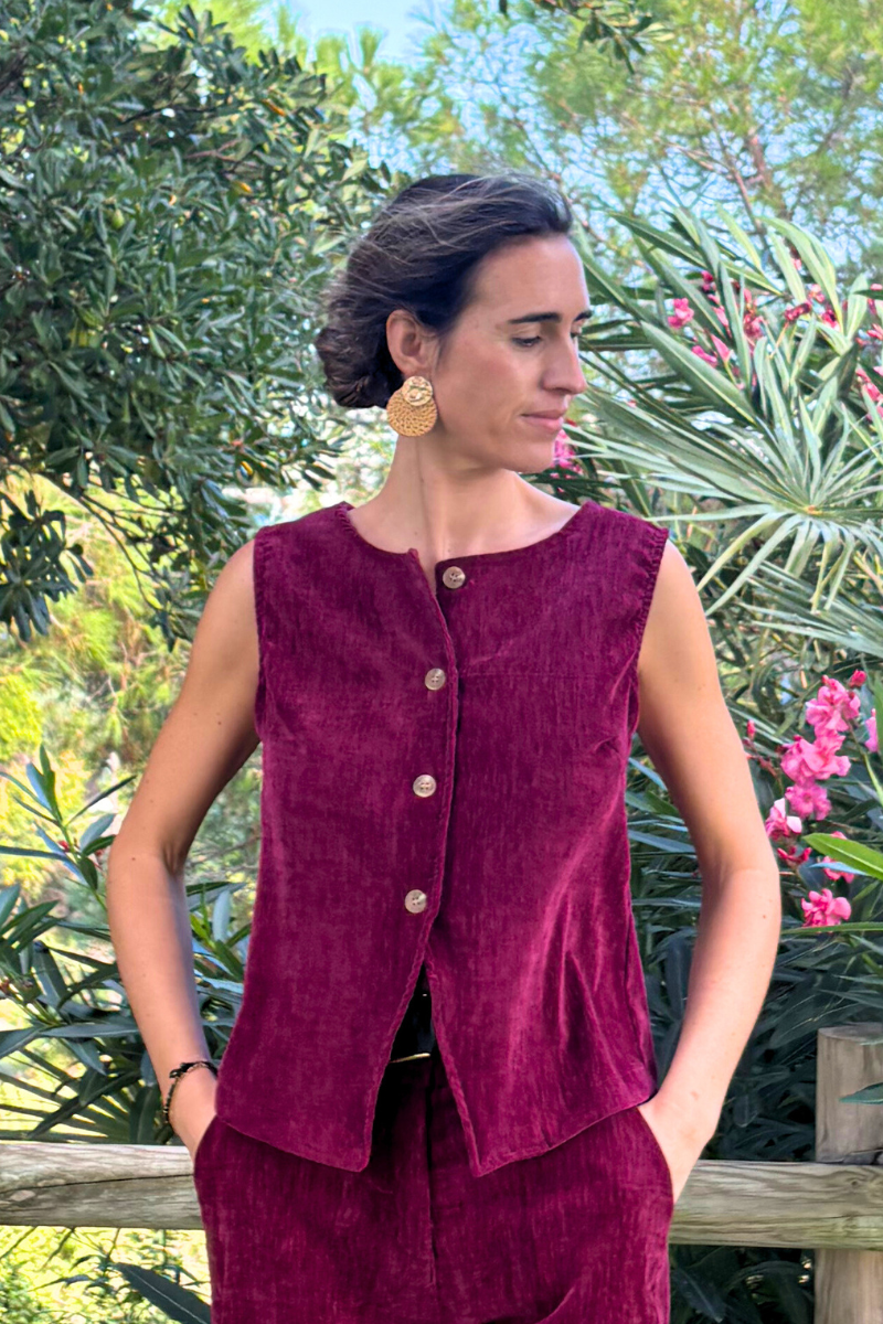 Disponible en granate y negro, este chaleco de pana puede llevarse solo o como parte del conjunto Lamu, junto a su pantalón a juego. Perfecto para la temporada de otoño e invierno, se adapta a looks tanto relajados como formales, convirtiéndose en una prenda versátil y atemporal.