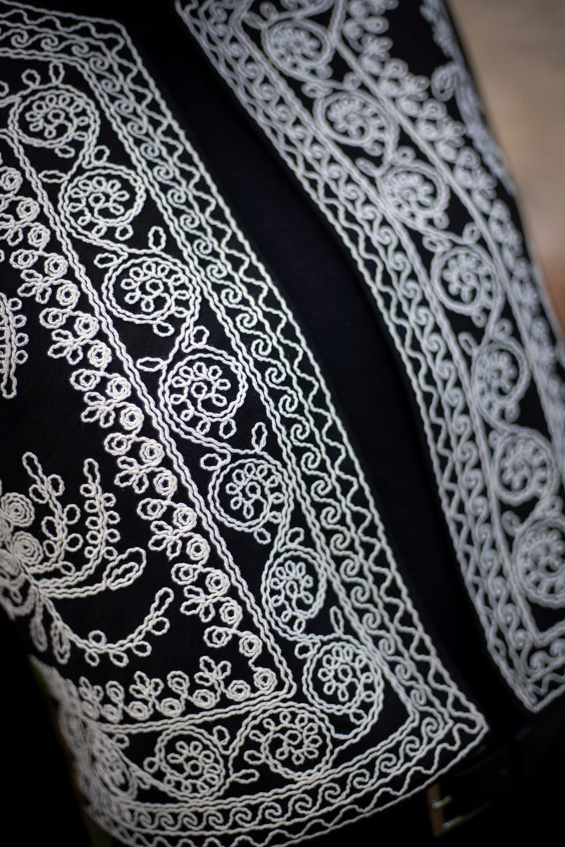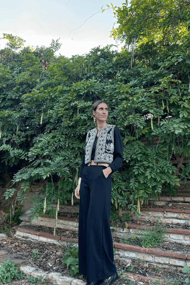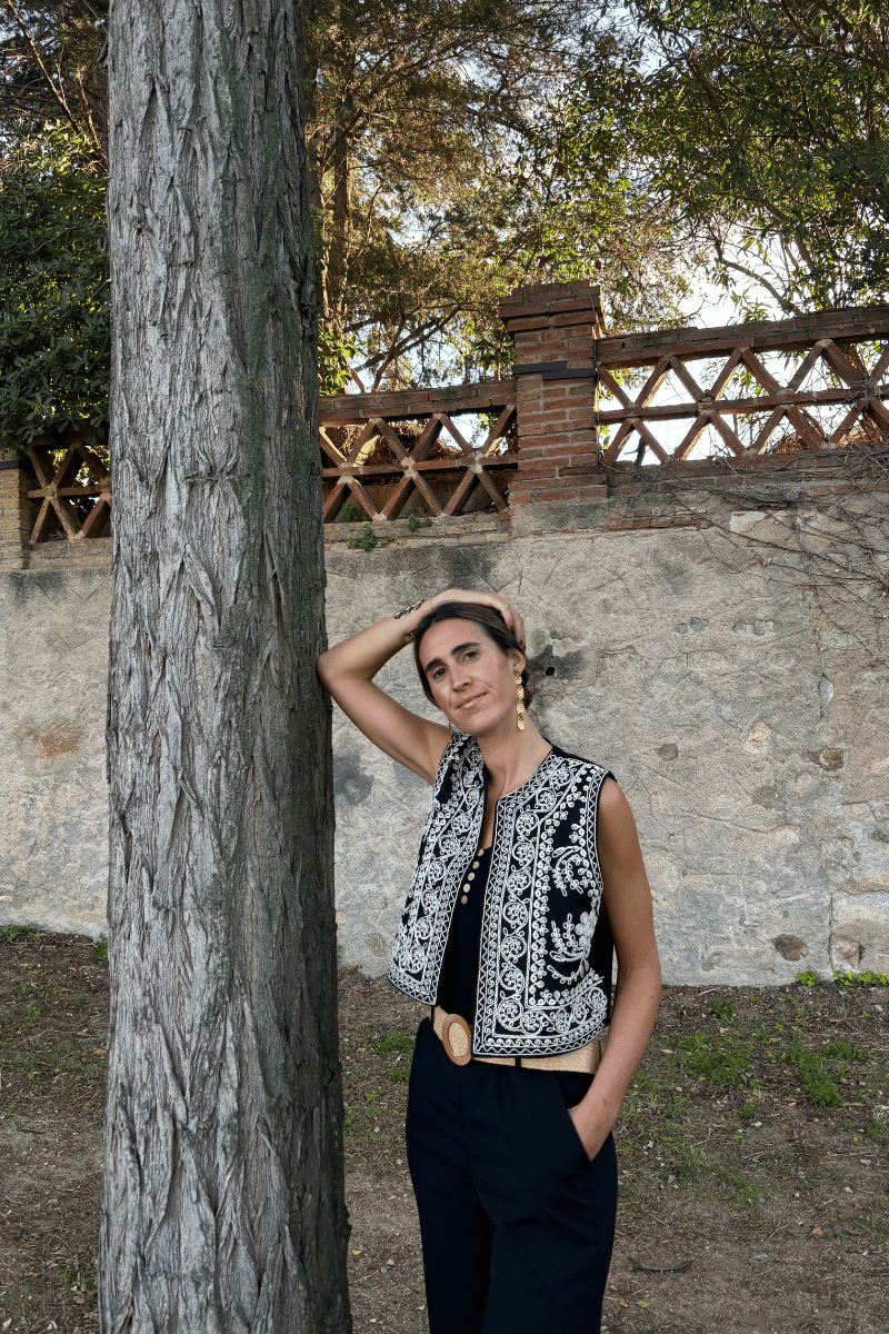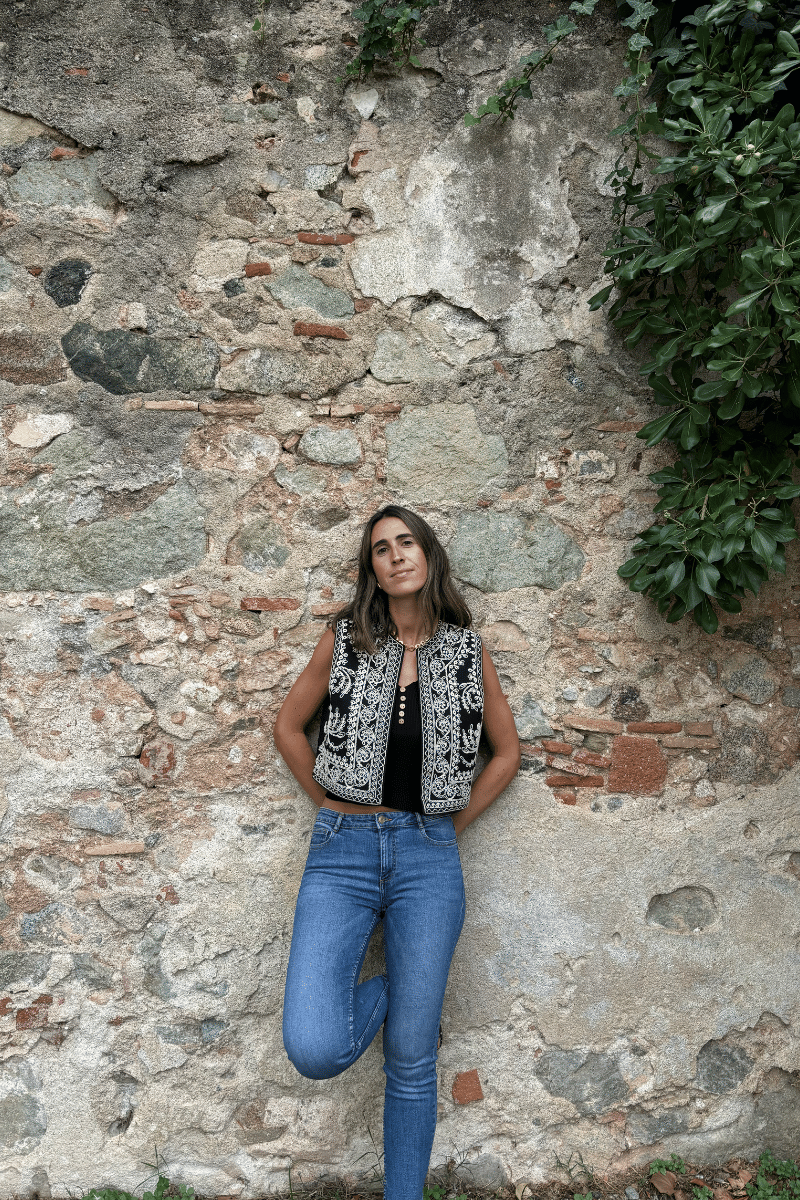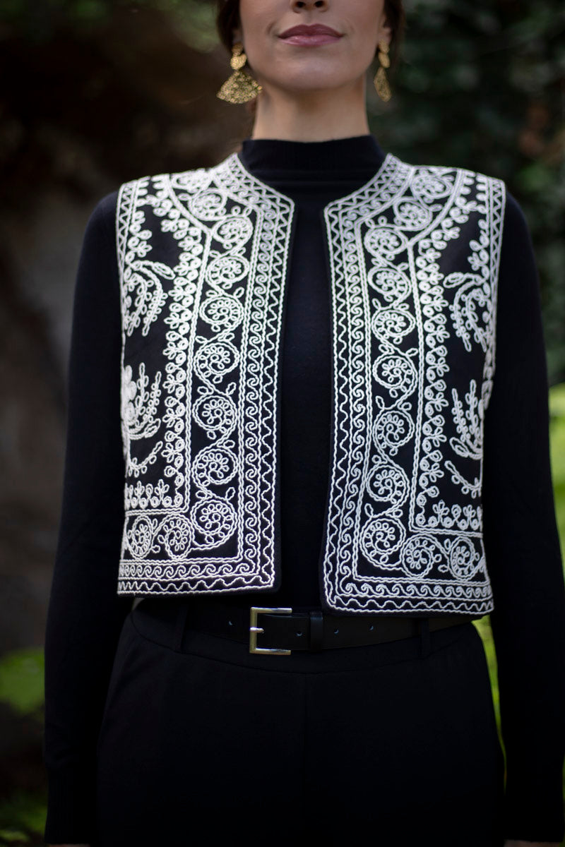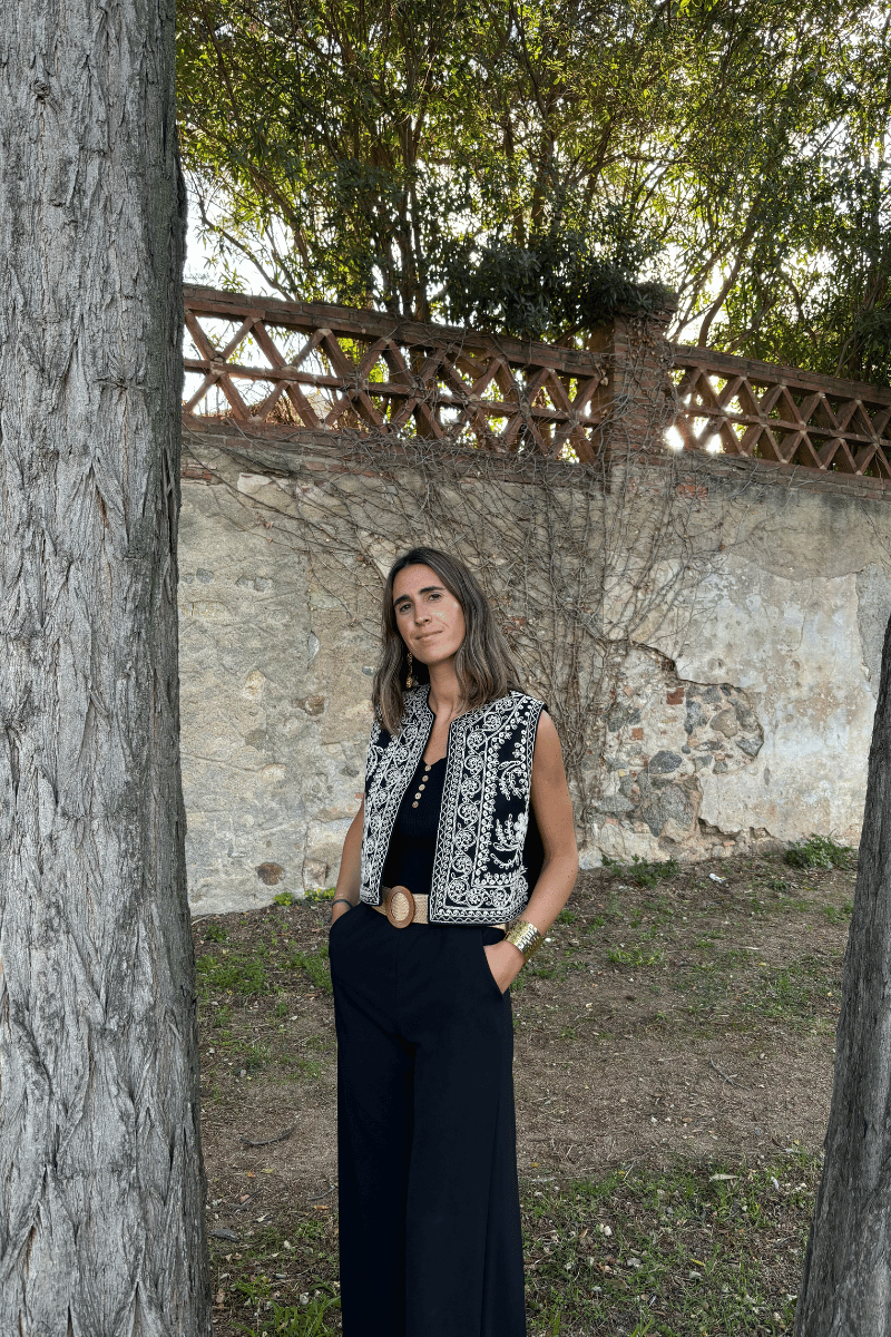 This elegant black vest, made 100% of polyester, stands out for its delicate beige embroidery, adding a touch of sophistication to any outfit. Its open design without buttons offers a comfortable and versatile fit.