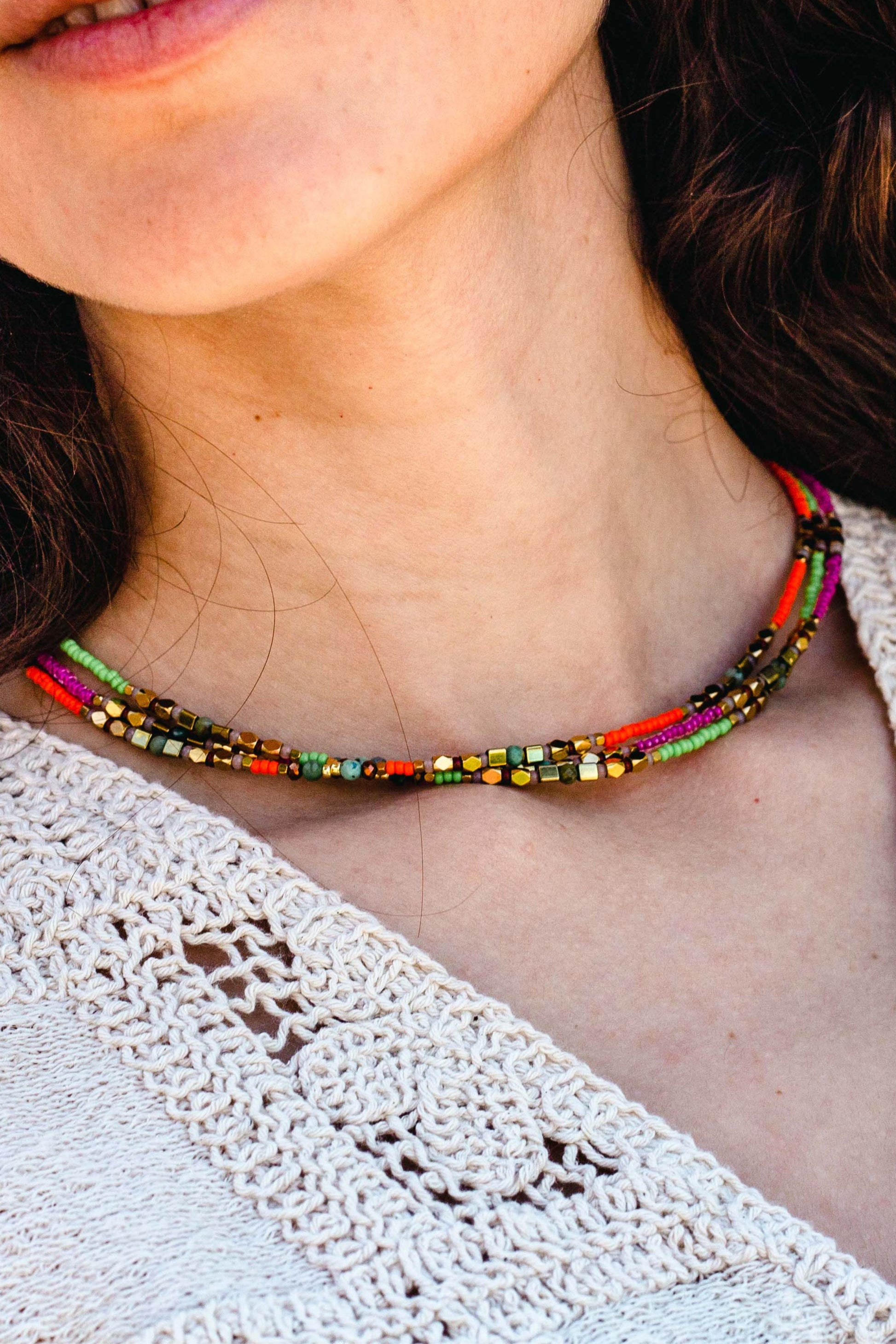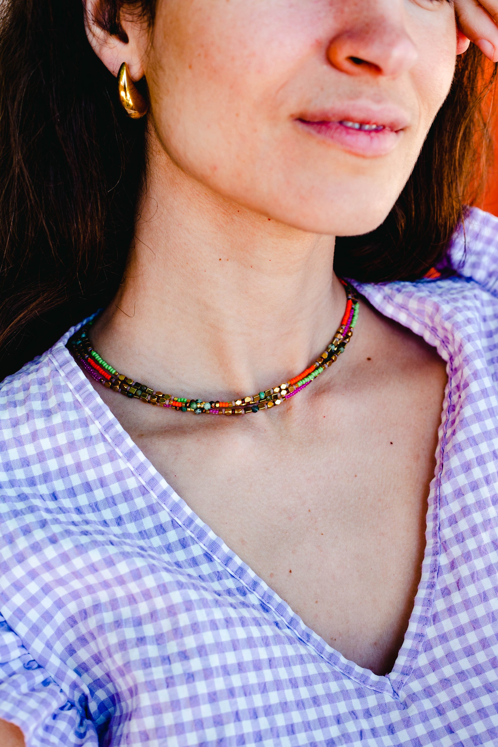 The outjo necklace, timeless and elegant, is an infallible choice to add a touch of light and elegance to your daily outfit. Available in 4 colors: Fuchsia, pink, orange, and green.