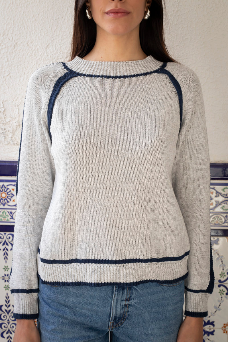 The Abadla sweater is an essential garment for spring days and summer nights. Made from 100% cotton, it stands out for its softness and lightness, providing a feeling of freshness and comfort at all times. Available in a combination of two colors: blue with gray, it is ideal for completing your seasonal looks with a casual and chic touch.