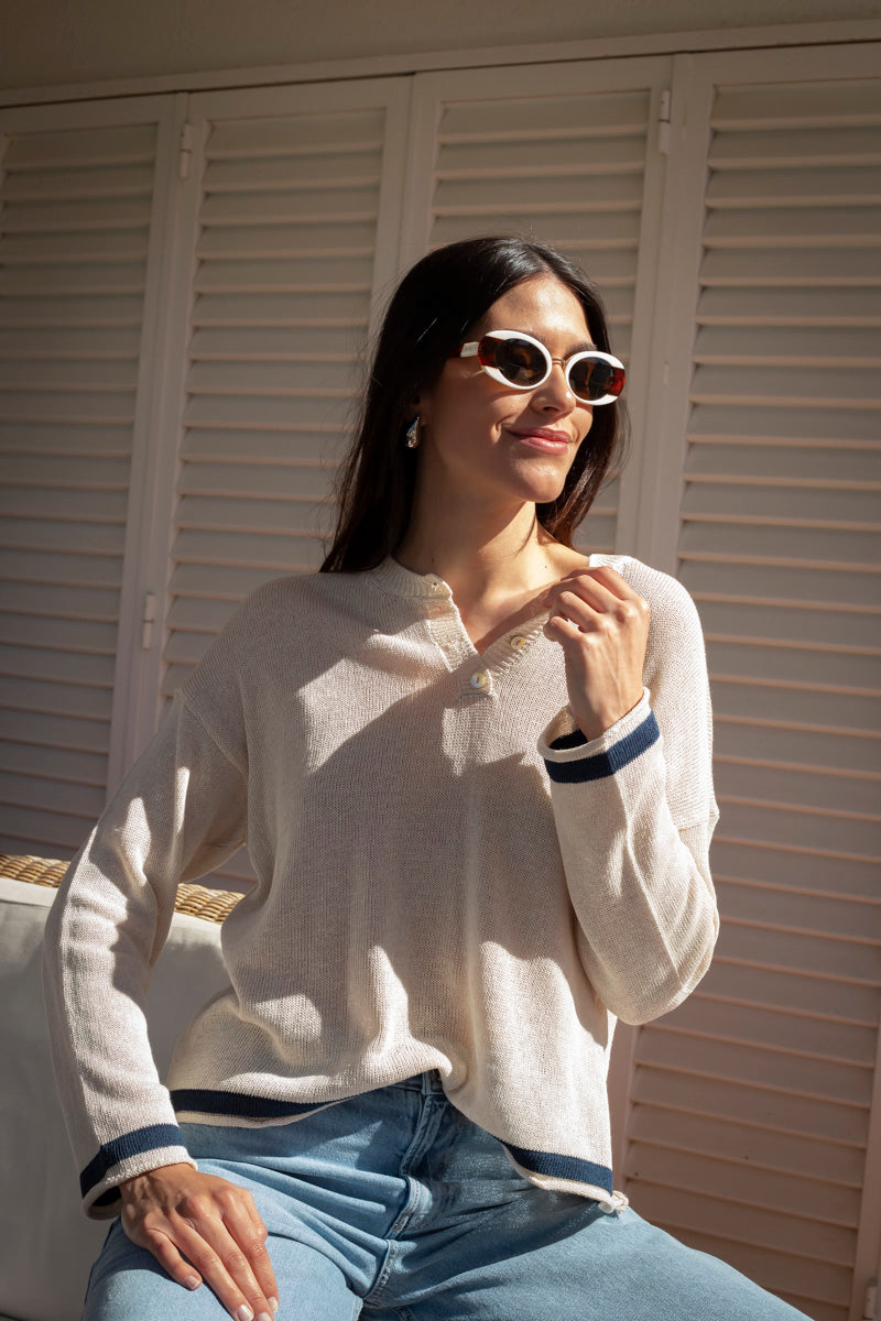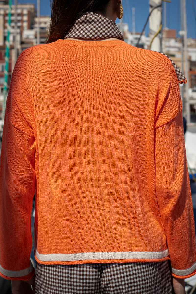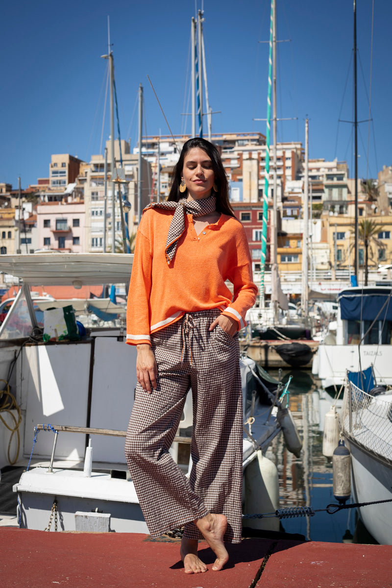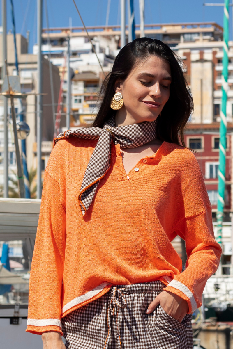 The Amtar sweater combines comfort and originality in a garment ideal for day-to-day wear. Available in two color combinations, beige or orange, its bicolor design adds dynamism and a different air to your look. It features two decorative buttons at the neckline, an elegant detail that adds personality without overwhelming.