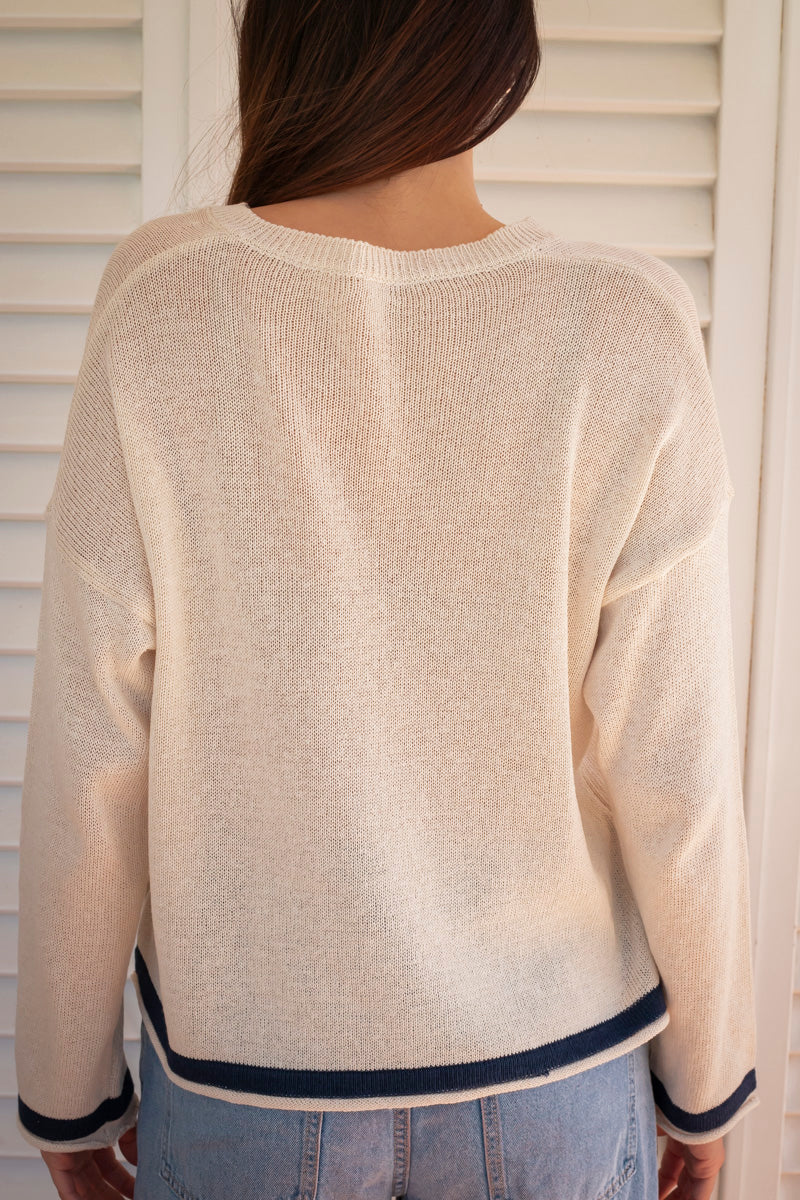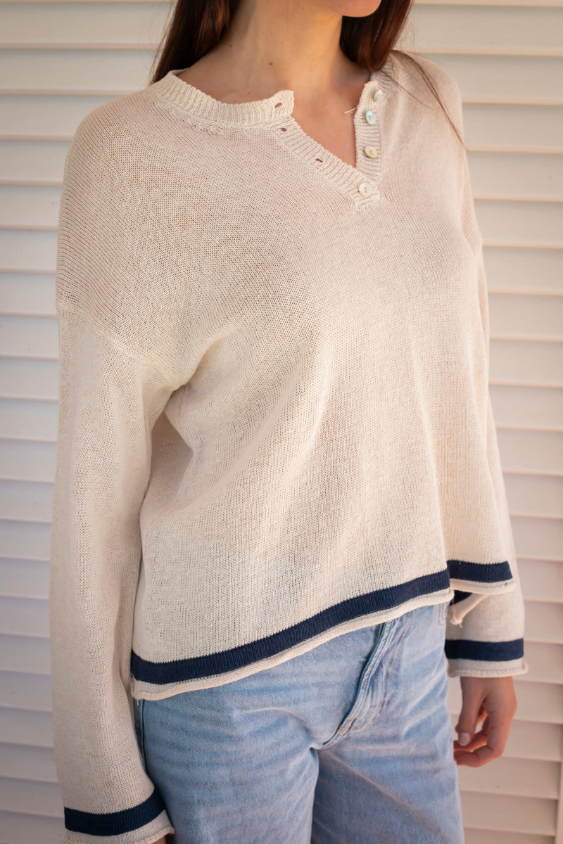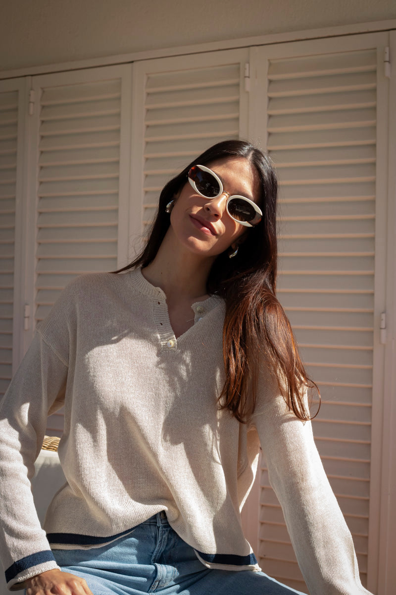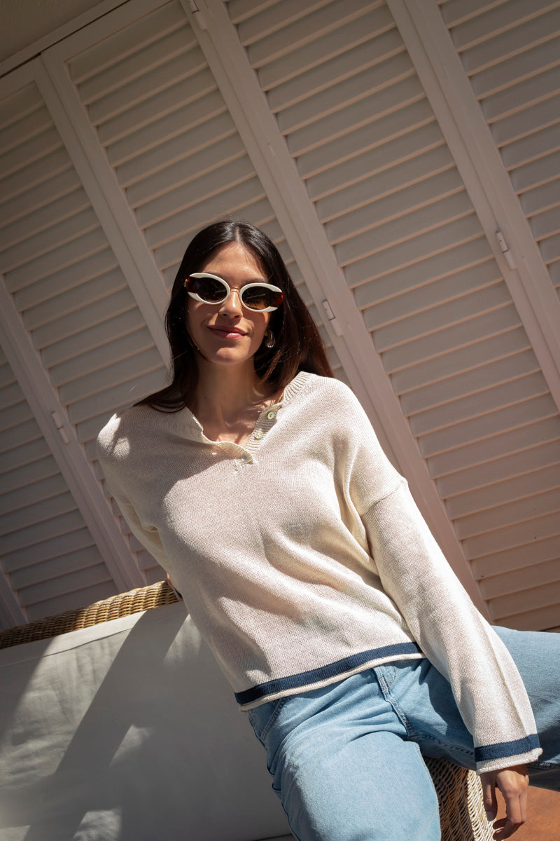 The Amtar sweater combines comfort and originality in a garment ideal for day-to-day wear. Available in two color combinations, beige or orange, its bicolor design adds dynamism and a different air to your look. It features two decorative buttons at the neckline, an elegant detail that adds personality without overwhelming.