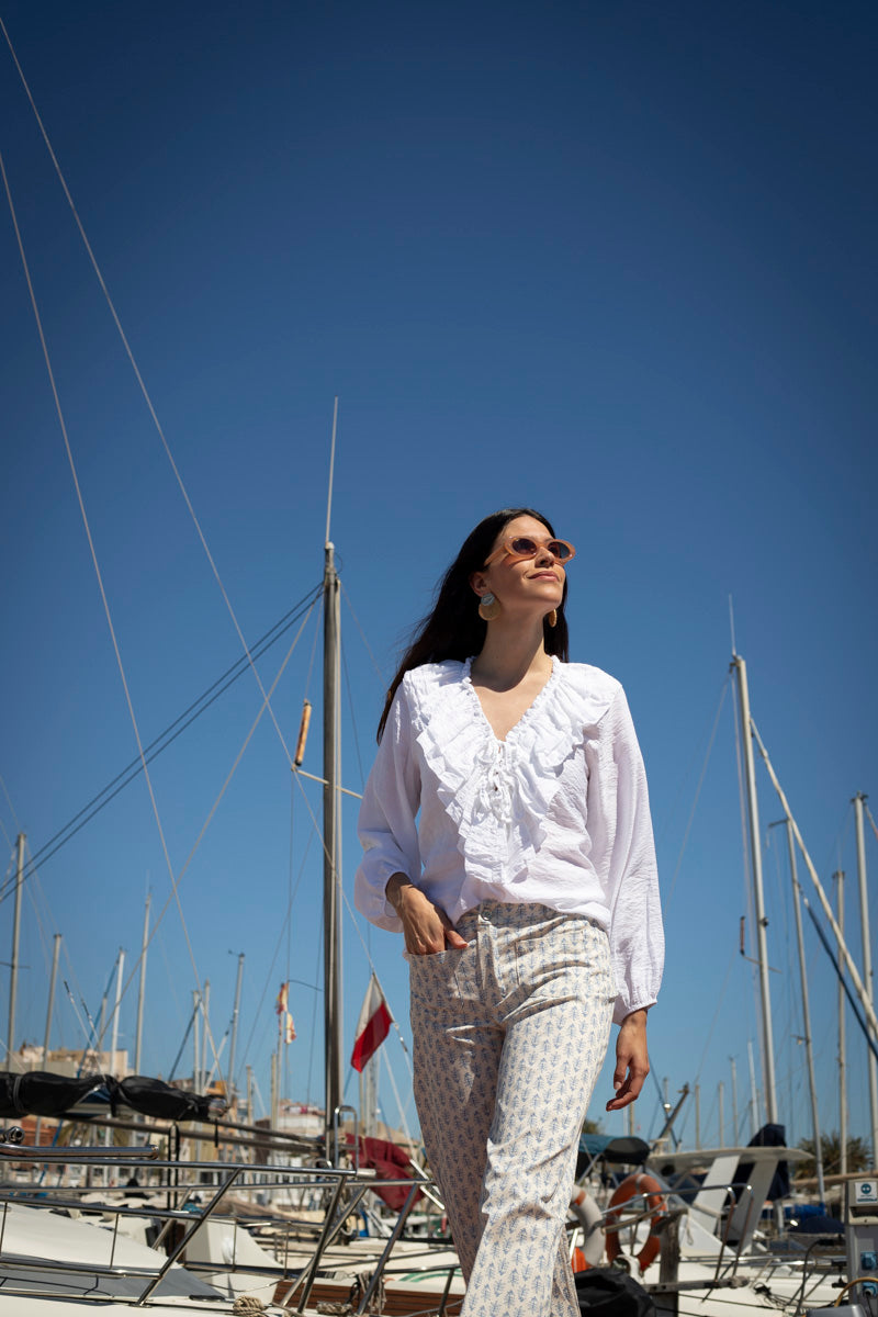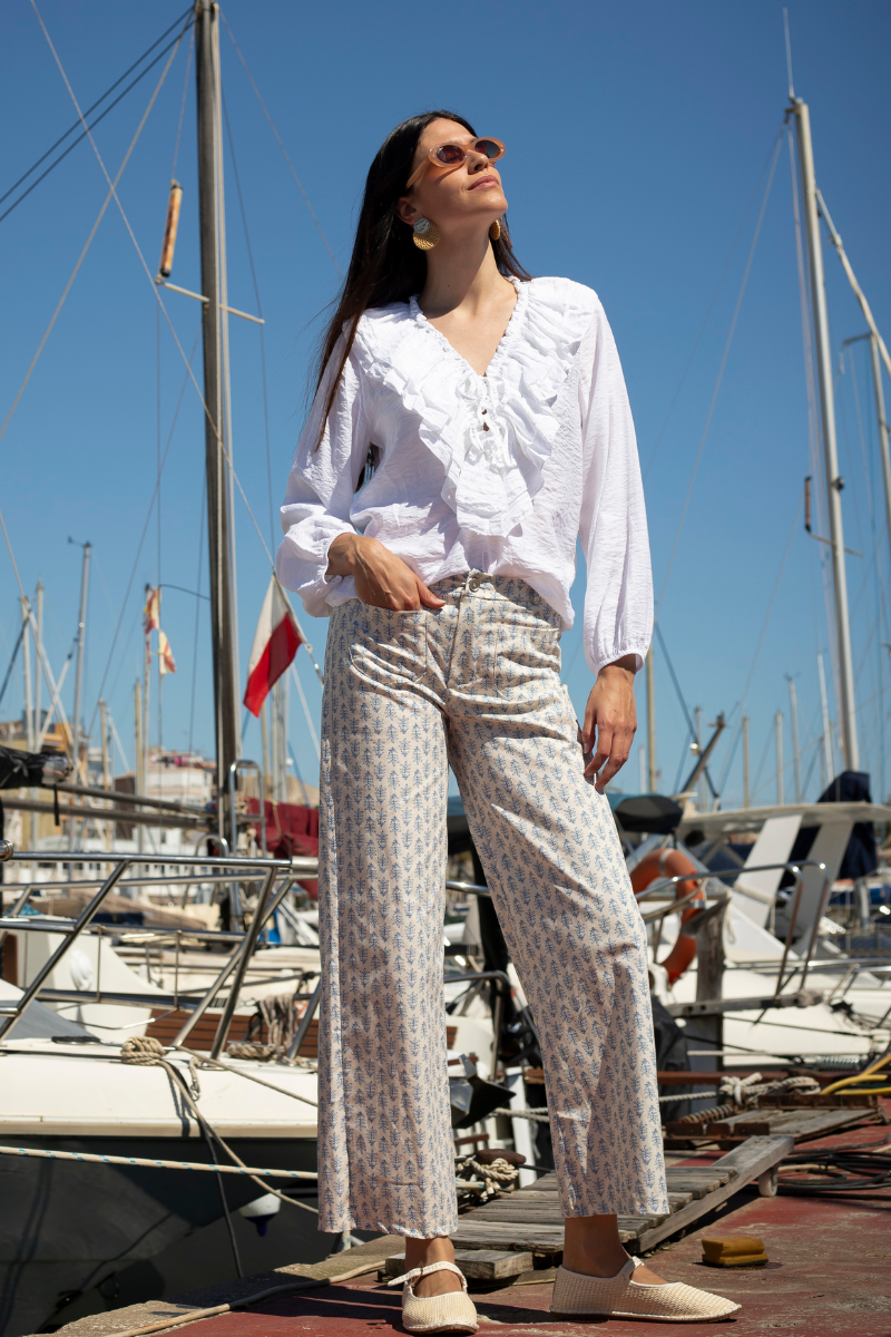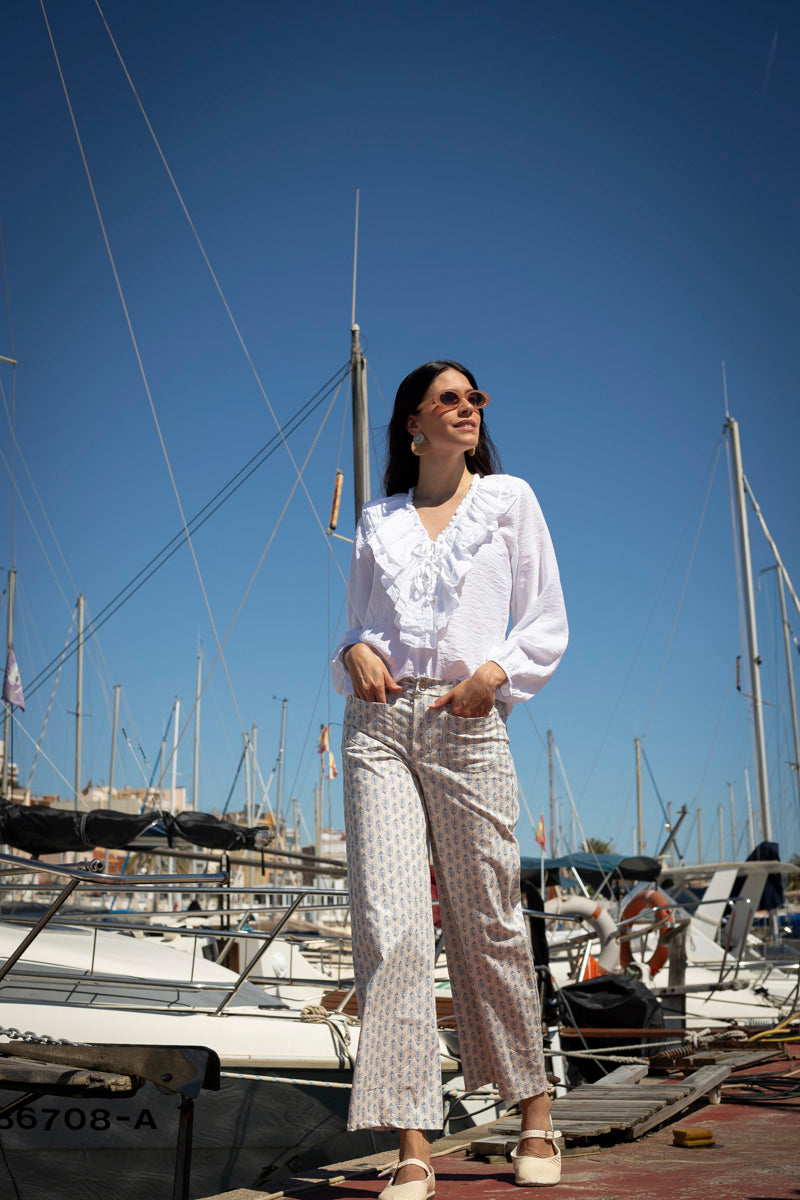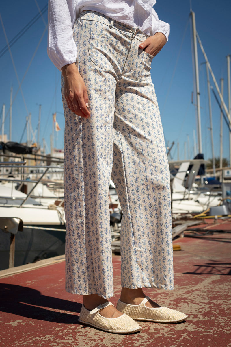 The Kita pants are the perfect combination of relaxed style and absolute comfort. Its print of small blue flowers on a white background gives it a fresh, feminine, and spring-like air, ideal for this season.
