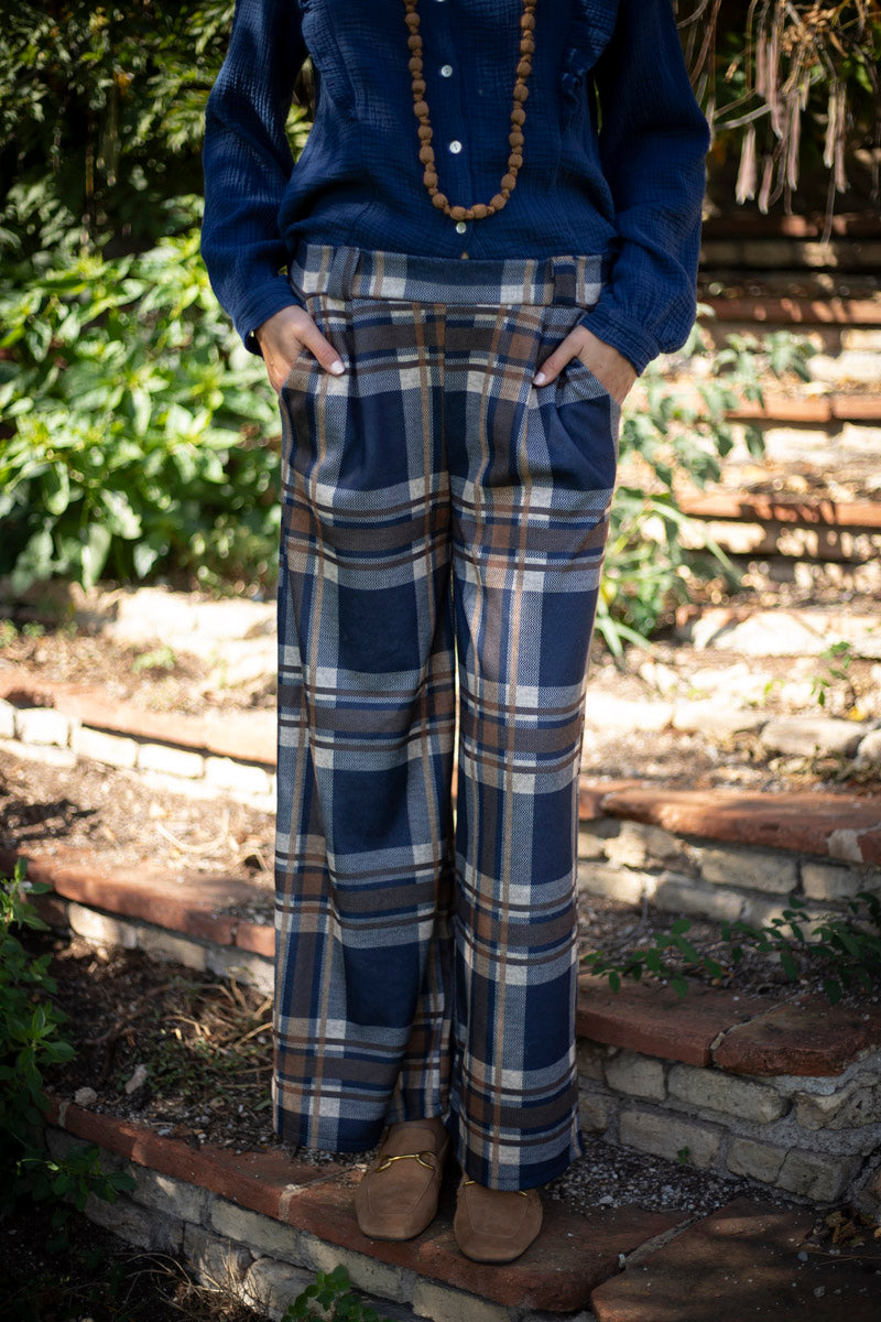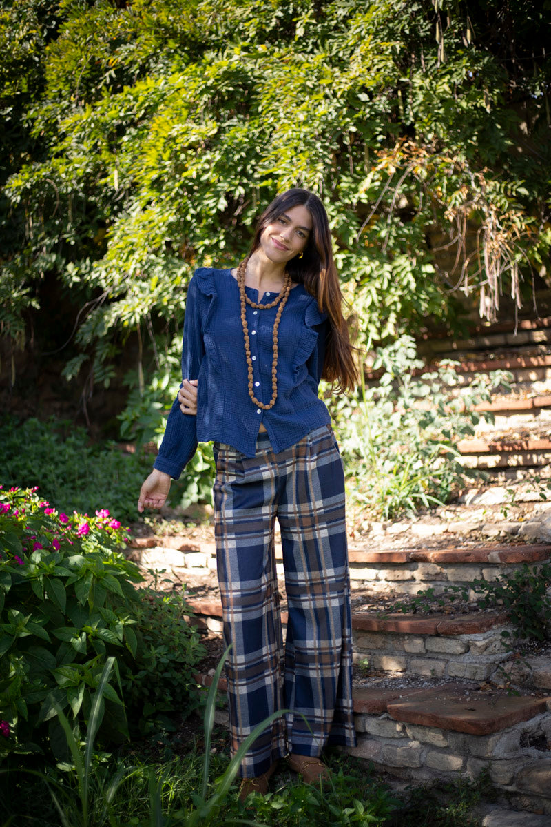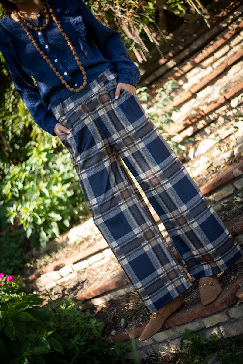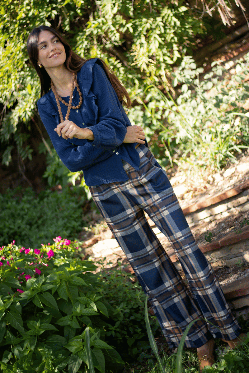 With its checkered pattern in shades of brown, blue, and white, the Mocuba Pants are the perfect garment for those looking to wear this year's fashion with style. Its elastic and one-size design comfortably adapts to different silhouettes, providing you with an ideal fit for any occasion.