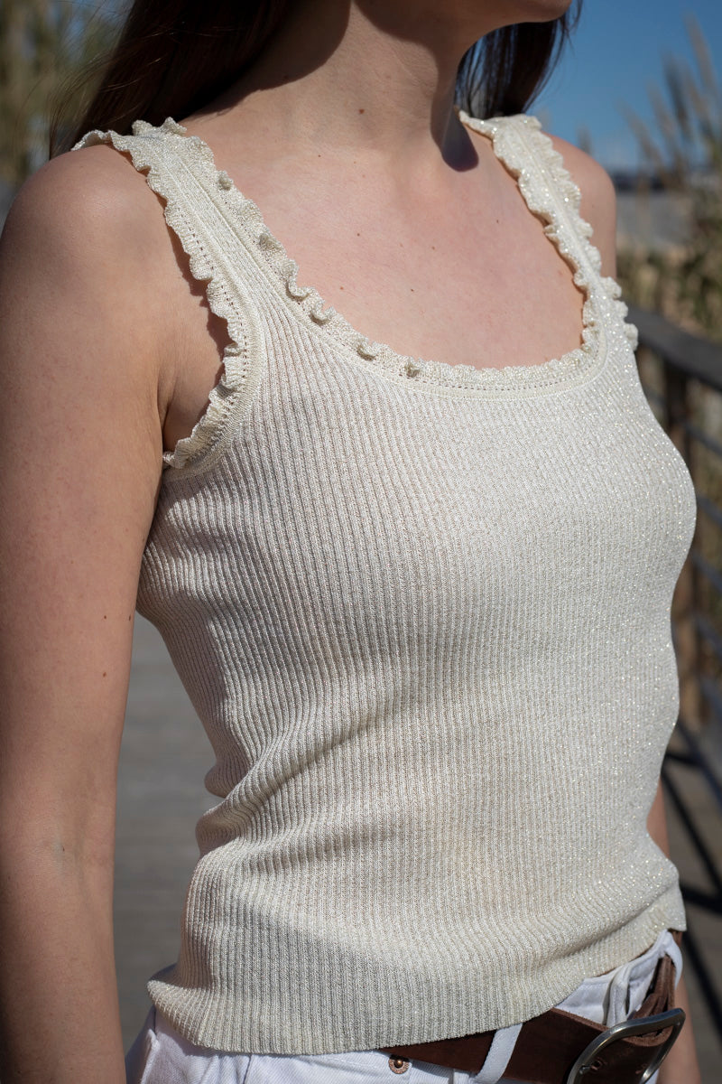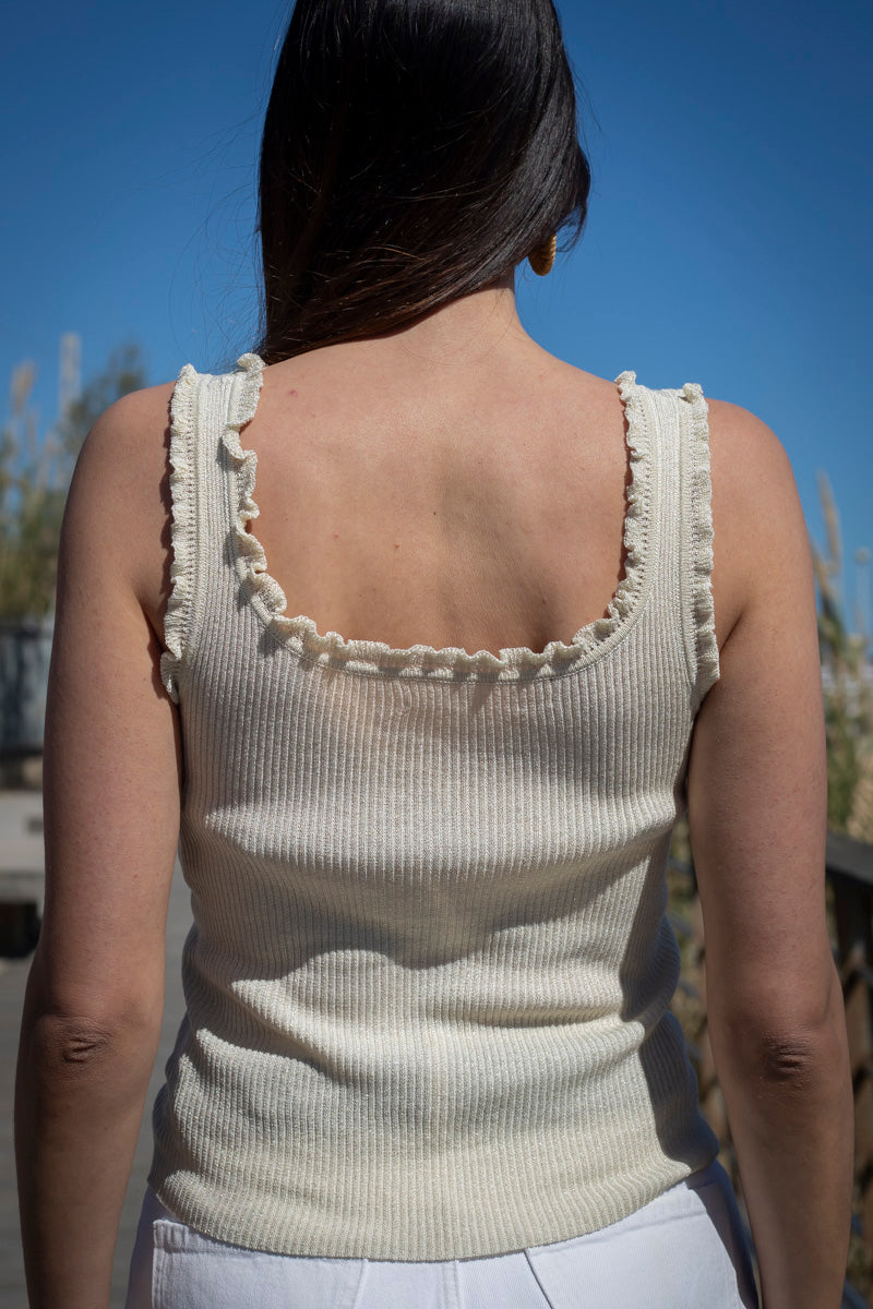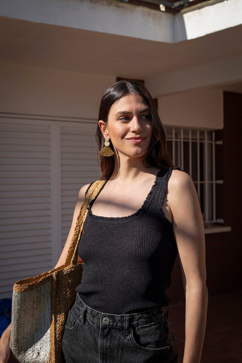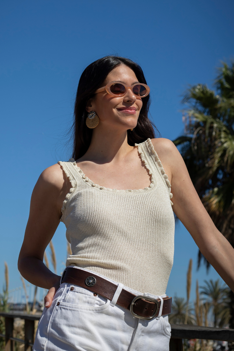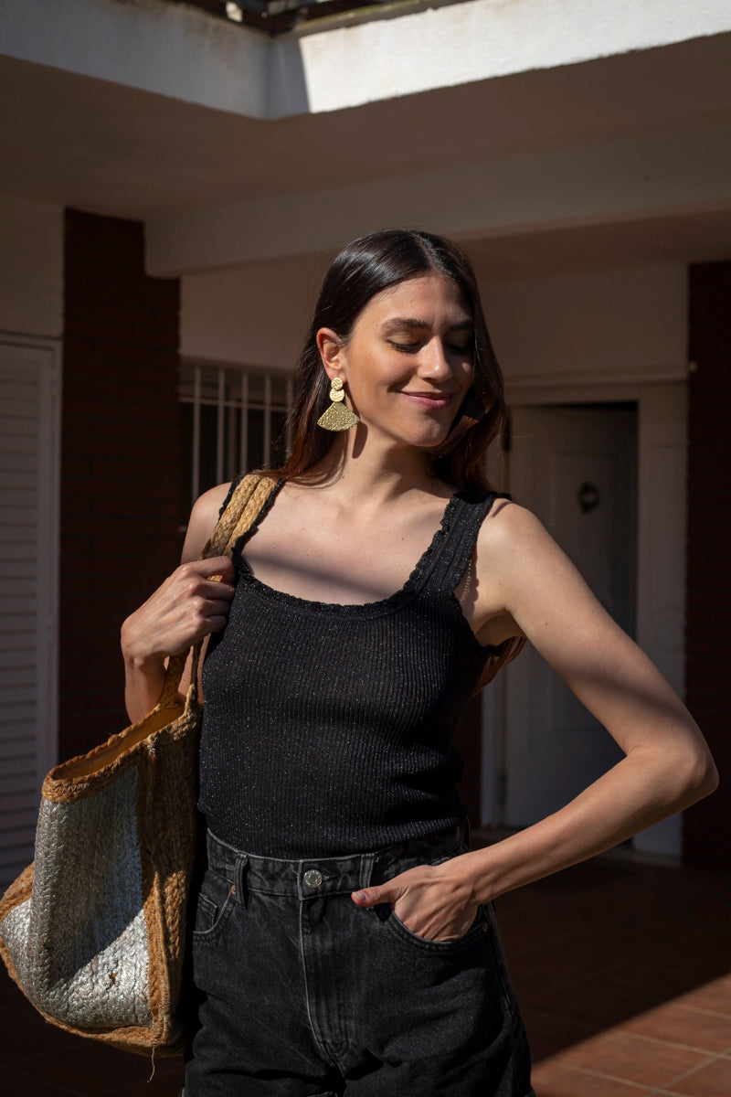 Sleek, feminine, and with details that make a difference. The Bejaïa top is made of lightweight viscose, perfect for sunny days. Its strap design with wavy finishes gives it a delicate and original touch, and a subtle shine that captures the light and makes a difference. Available in beige and black, two versatile shades to mix and match as you like. Fresh, comfortable, and very easy to wear: an essential for your summer.