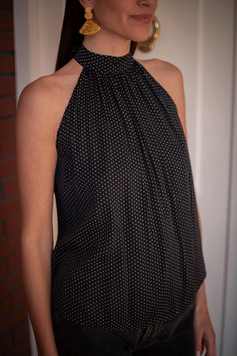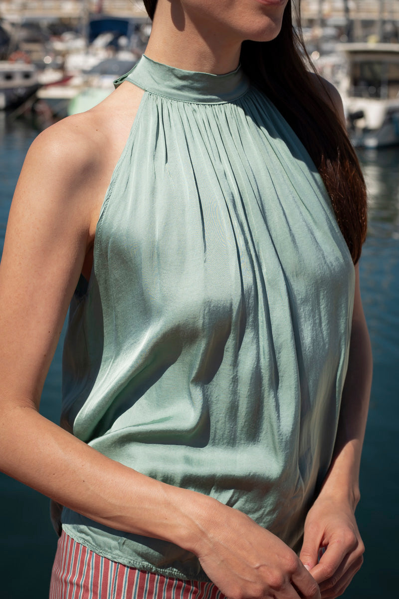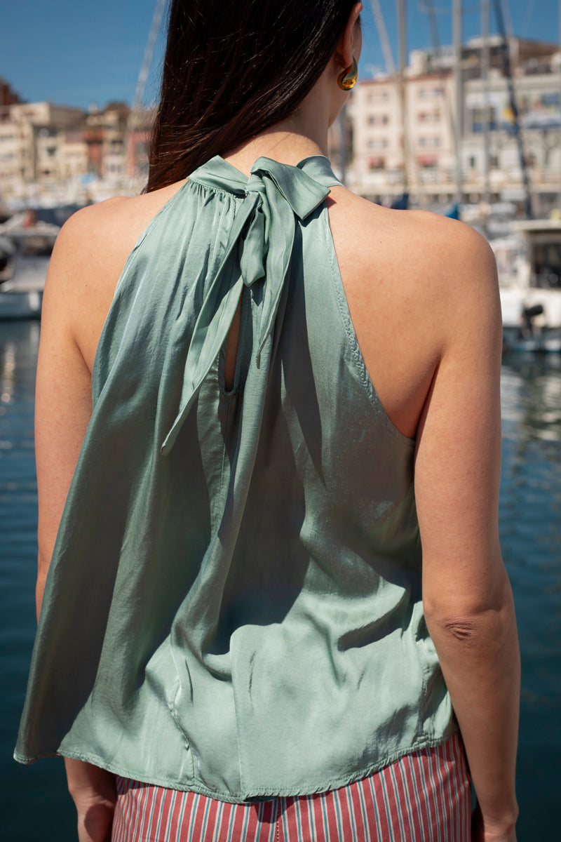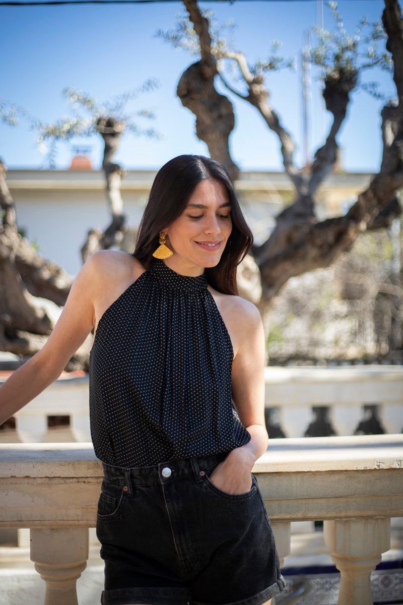 With a very flattering halter neck, the Bhalil top stands out for its sleeveless design and lightweight silhouette that make it perfect for hot days. It is the ideal basic to wear with skirts, pants, or shorts, always providing a relaxed and elegant style. Available in four versatile shades—blue, white, black, and green—.