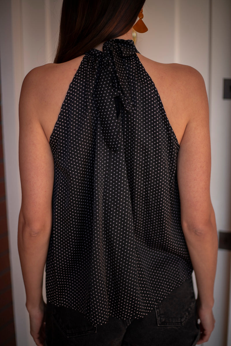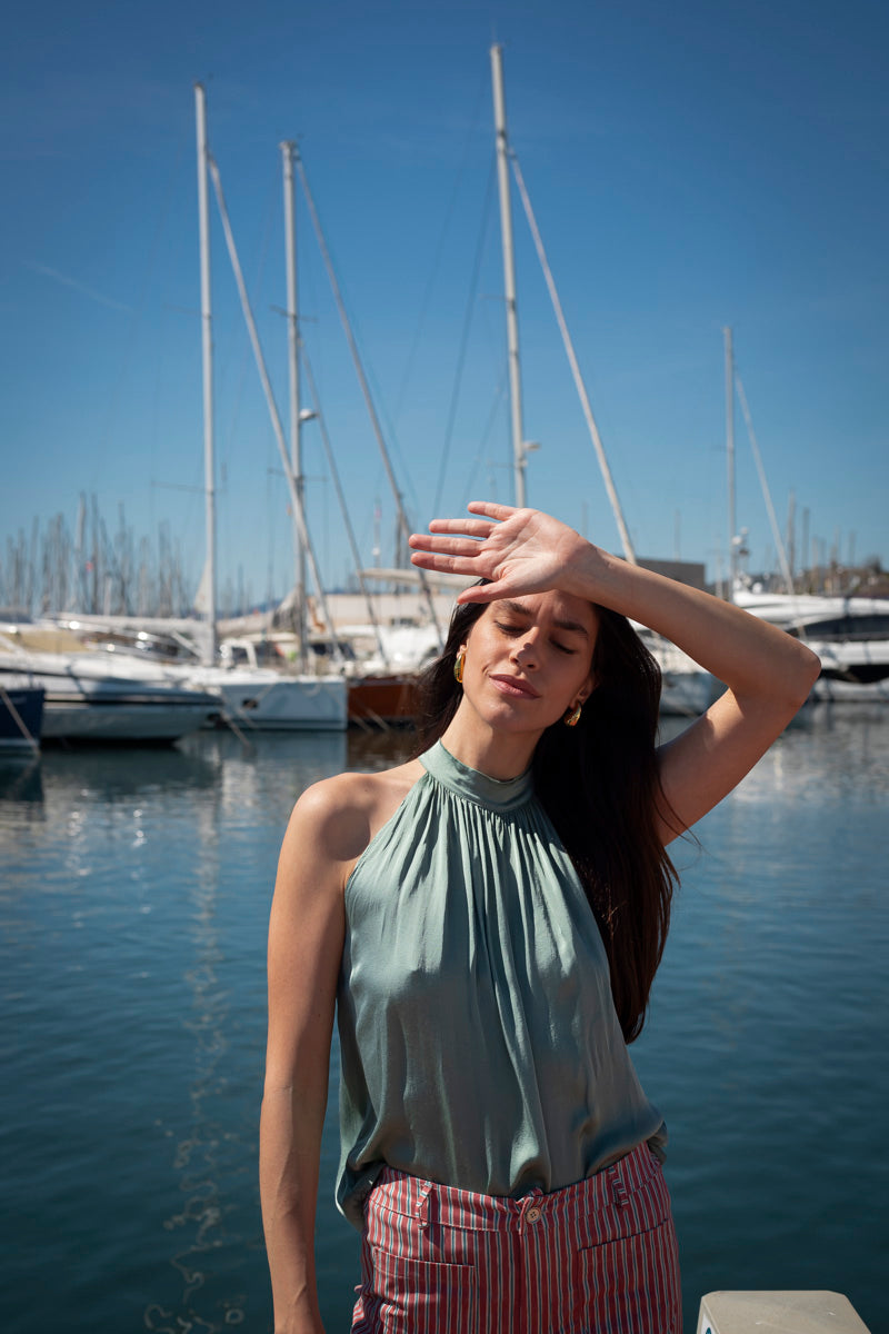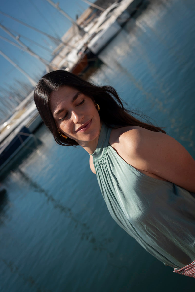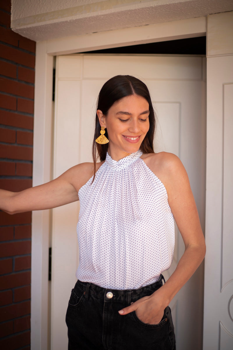 With a very flattering halter neck, the Bhalil top stands out for its sleeveless design and lightweight silhouette that make it perfect for hot days. It is the ideal basic to wear with skirts, pants, or shorts, always providing a relaxed and elegant style. Available in four versatile shades—blue, white, black, and green—.