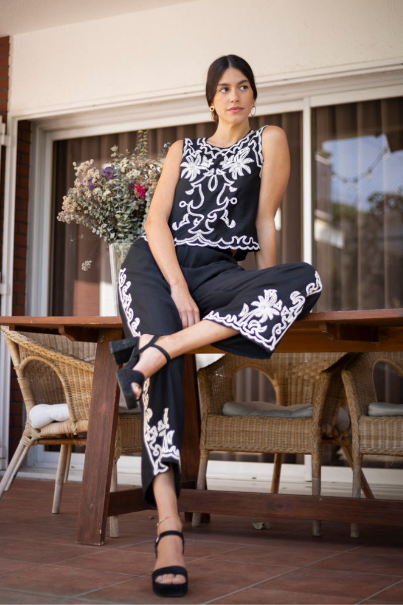 - The Assilah pants have a wide cut and have an elastic band that adapts to the waist.