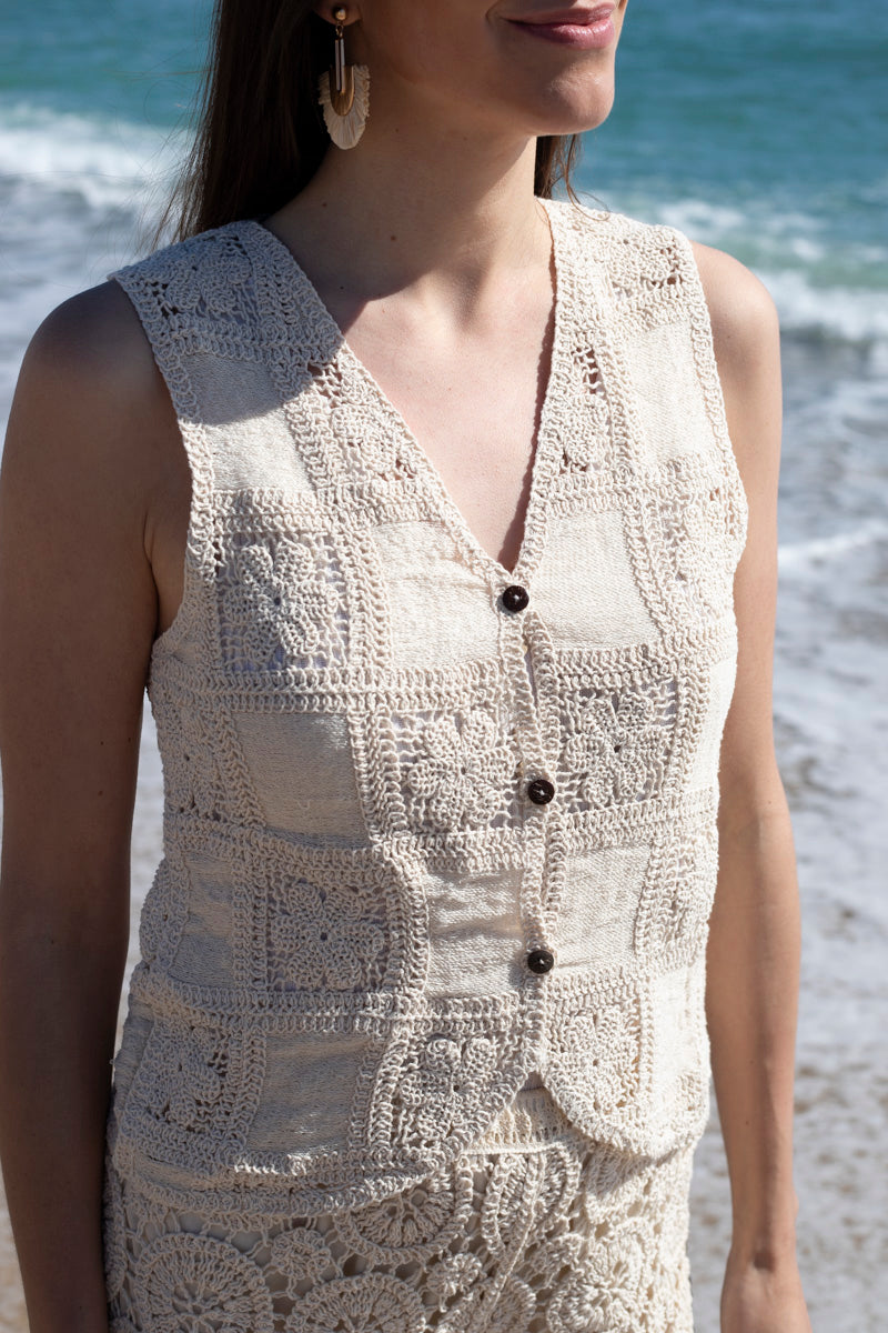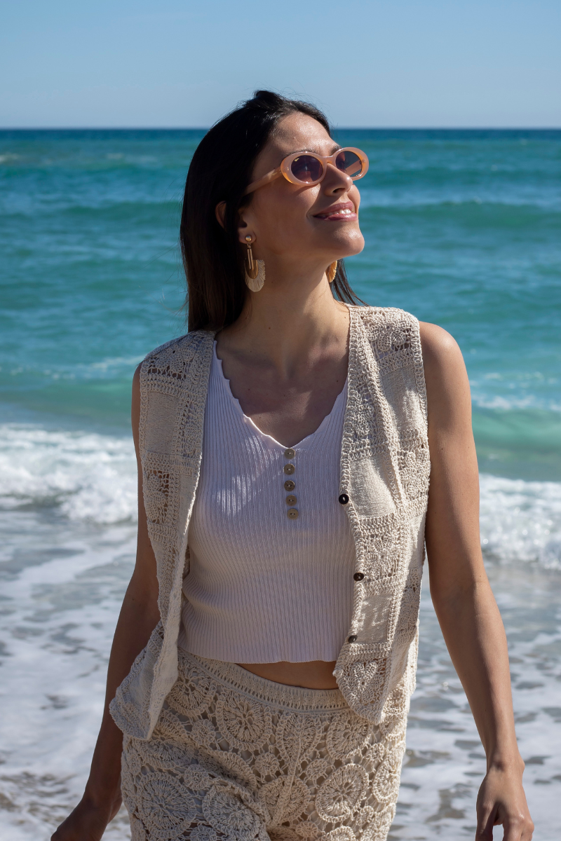 Our Total Look Berkane, made of 100% cotton, is the ideal choice for hot days. Its crochet design adds an artisanal and delicate touch that stands out in any look. Fresh, comfortable, and versatile, it is perfect for enjoying at the beach as well as for a stylish casual outfit. It is the perfect summer set.