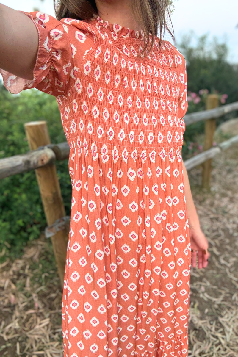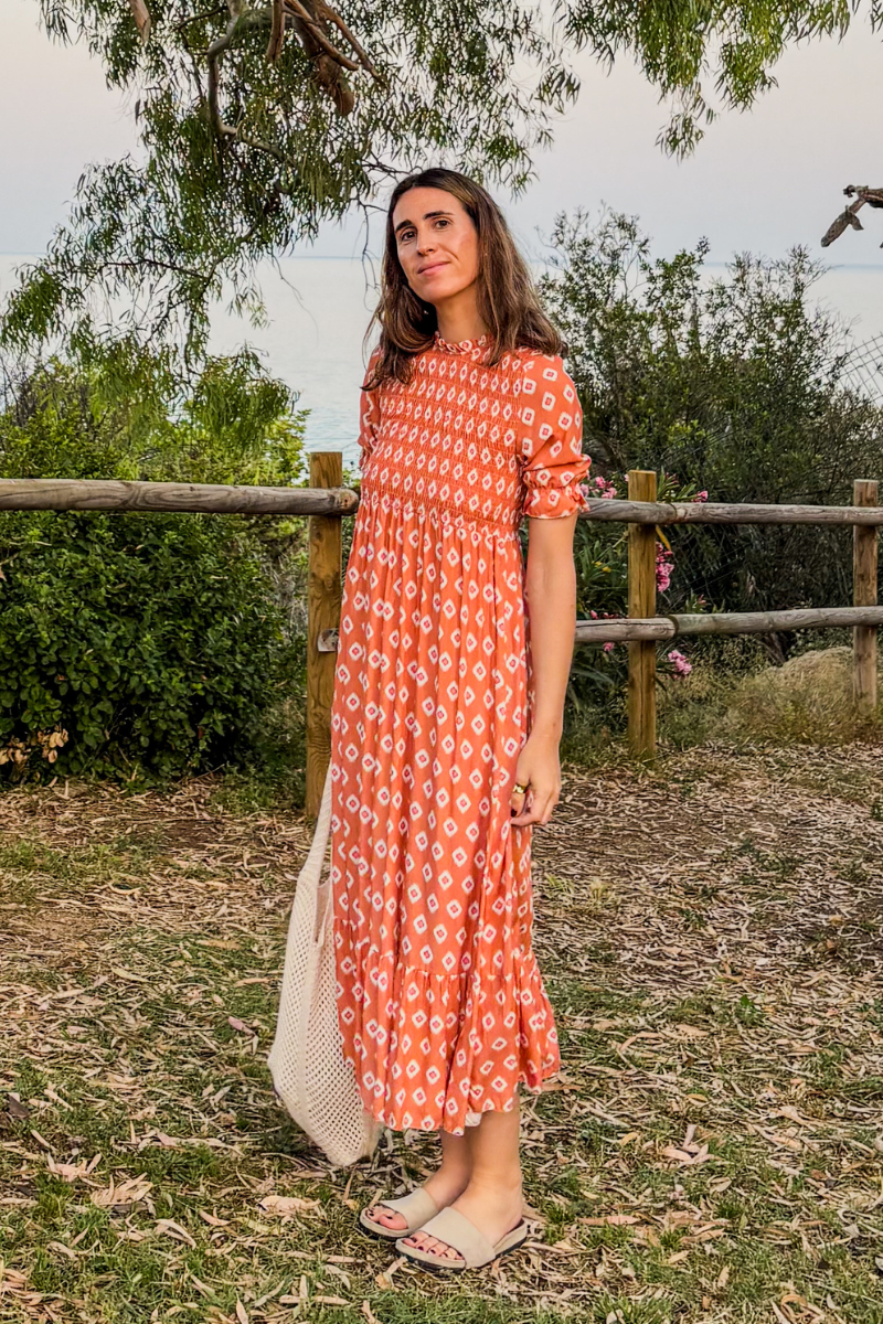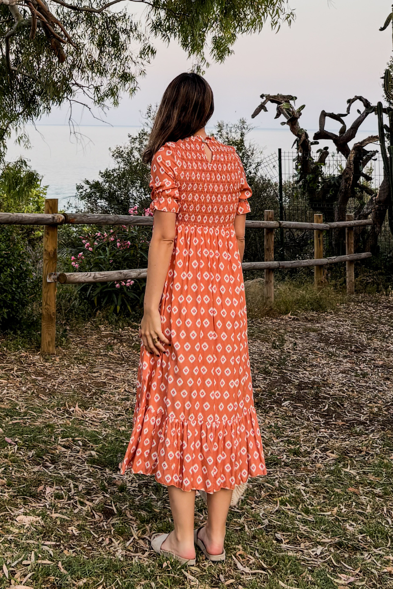 Its print adds a delicate and charming air, while the honeycomb bodice adapts elegantly, enhancing the figure.
