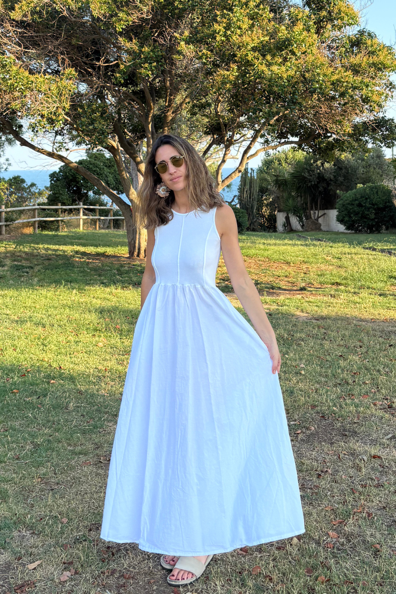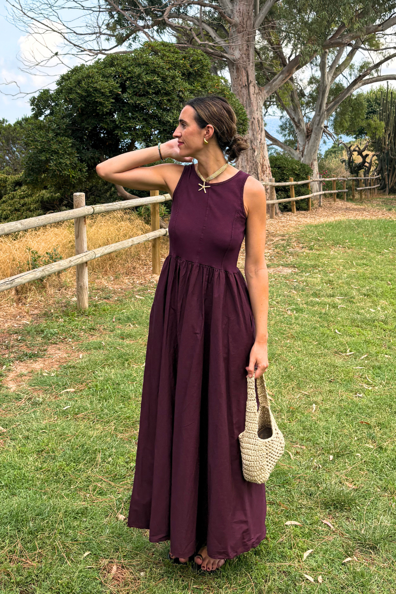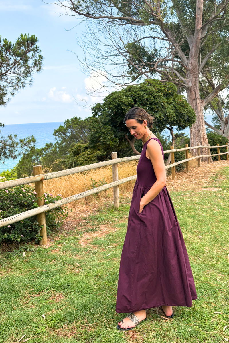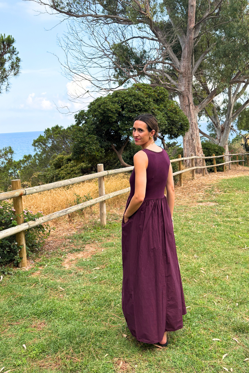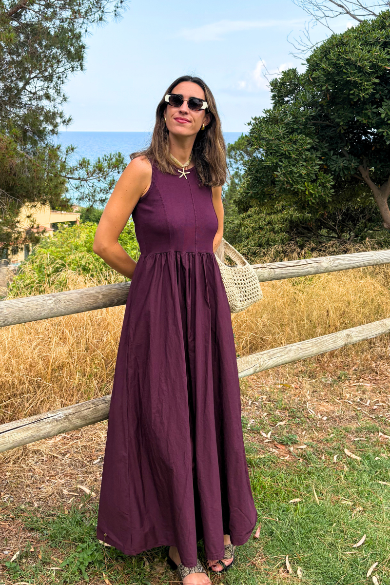 Sleeveless summer dress, made of 100% cotton in a deep wine tone. The top is fitted to the body, while the bottom has a flare, making it comfortable and cool for everyday wear. It includes two discreet side pockets. It is a lightweight garment, ideal for warm climates or to wear with a light jacket in the evenings.