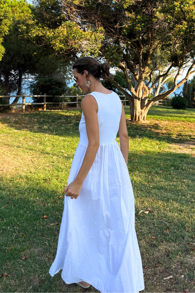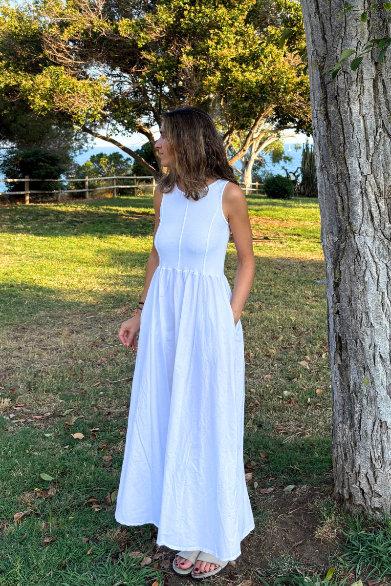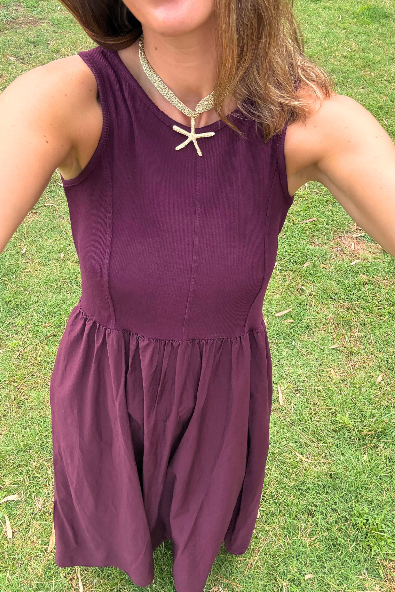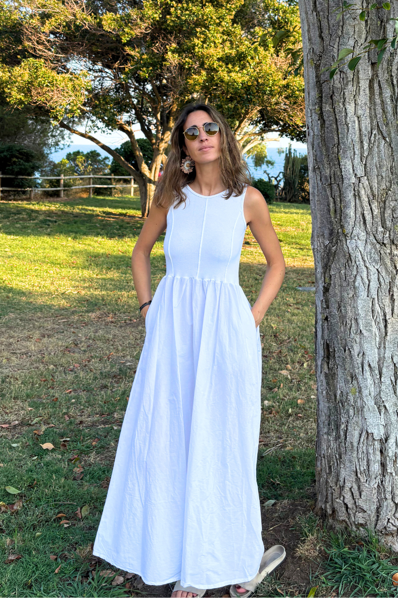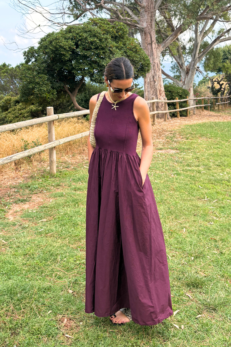 Sleeveless summer dress, made of 100% cotton in a deep wine tone. The top is fitted to the body, while the bottom has a flare, making it comfortable and cool for everyday wear. It includes two discreet side pockets. It is a lightweight garment, ideal for warm climates or to wear with a light jacket in the evenings.