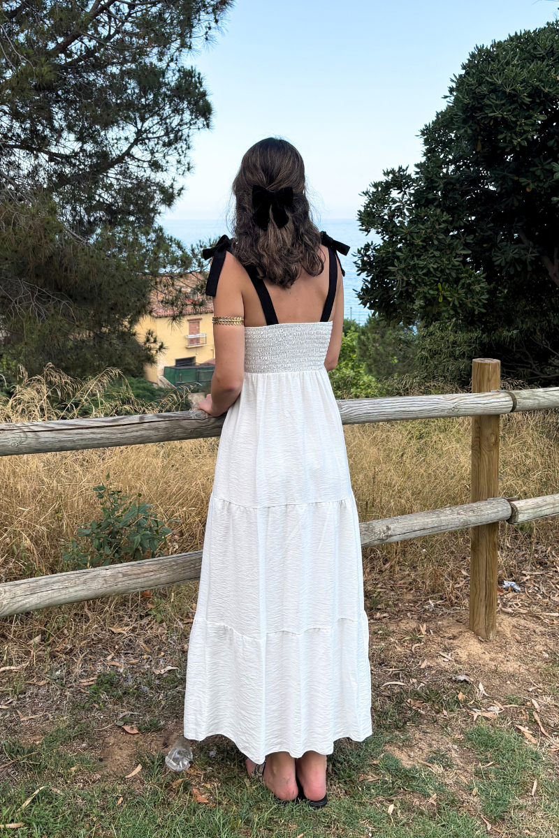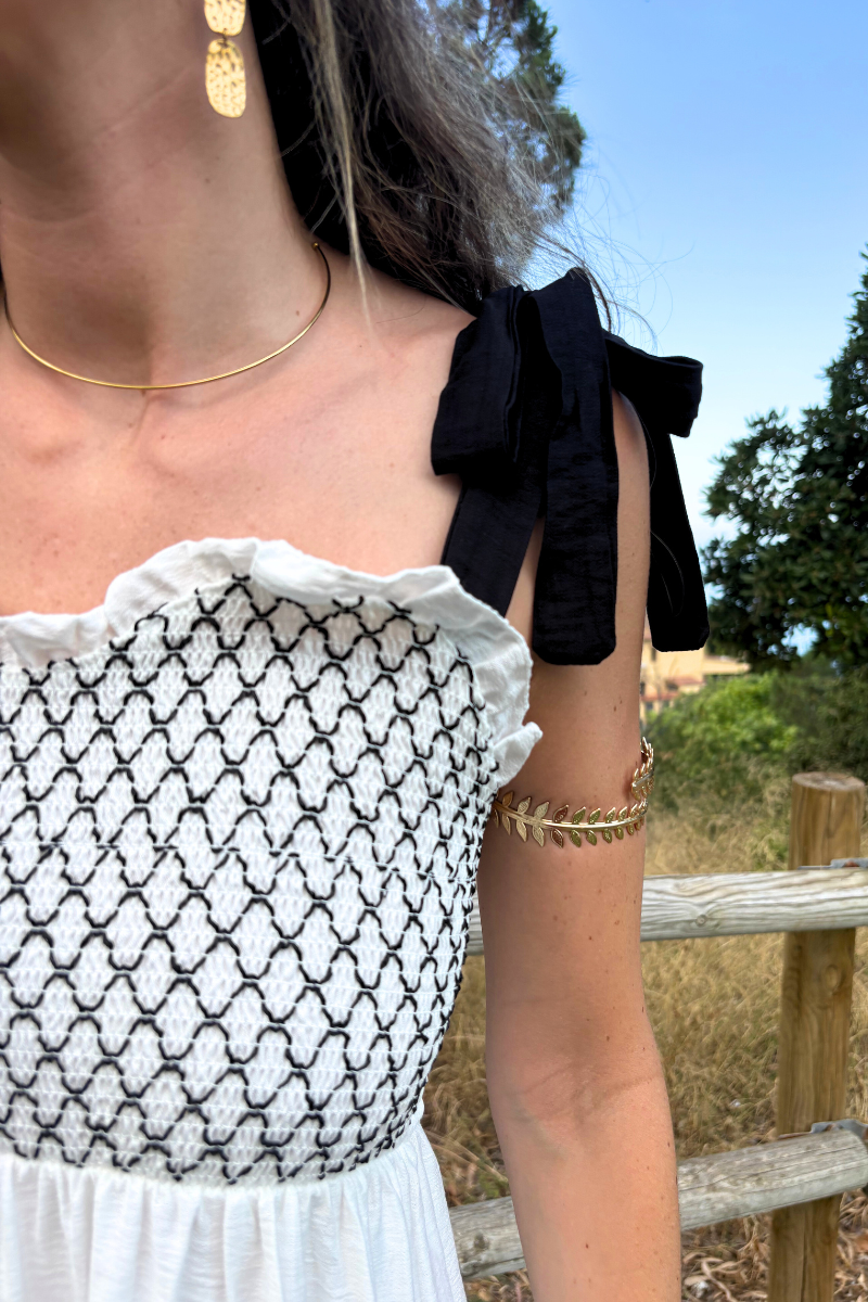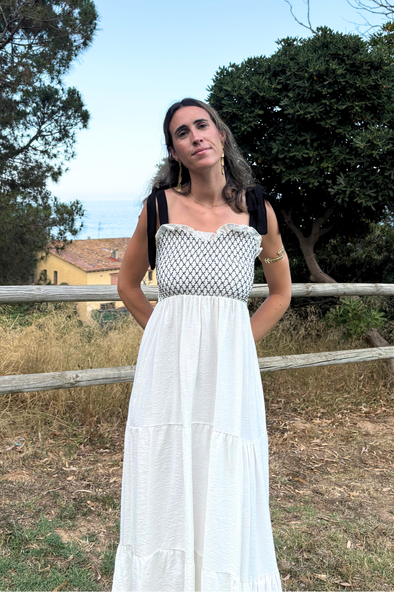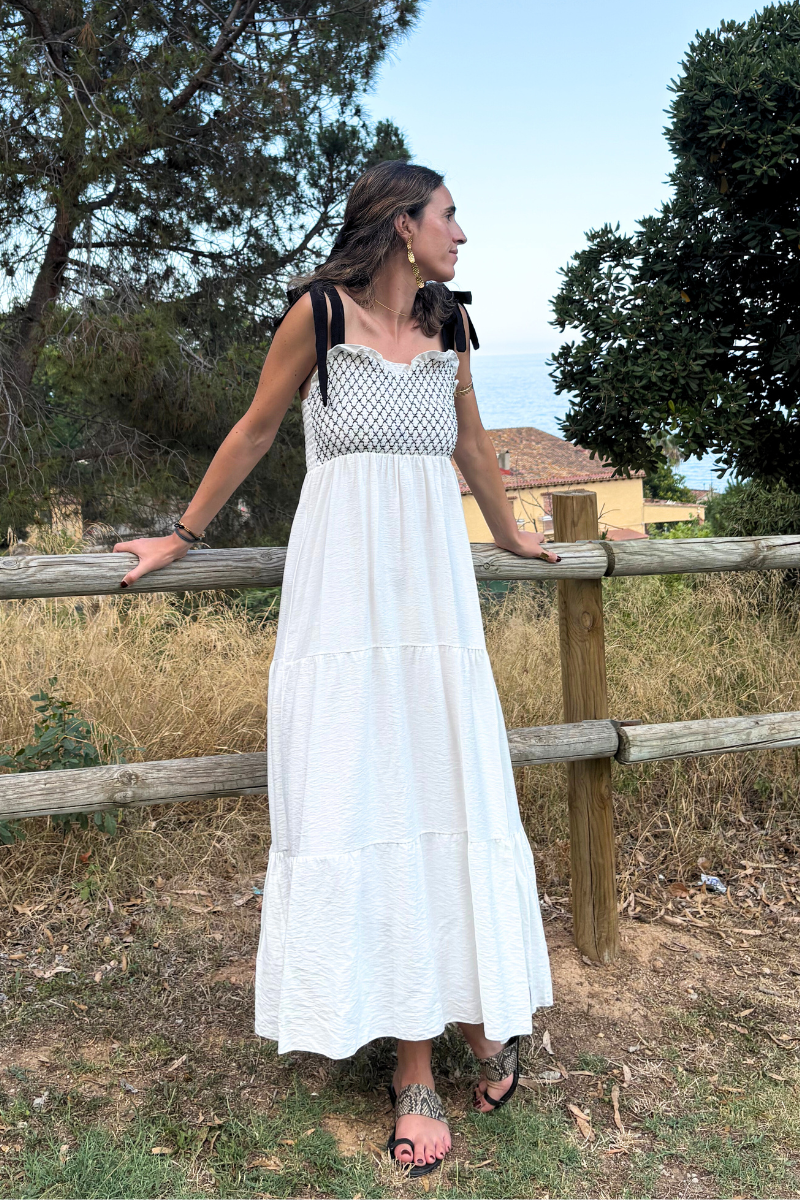 The Mombasa Dress is a fresh and versatile garment, designed to accompany you on hot days with style. Made in white, it features a honeycomb detail on the chest that comfortably fits the body. The black embroidery adds a special touch without losing simplicity, and the bow-shaped straps, also in black, allow for a personalized fit. A comfortable and easy-to-wear option, ideal for both casual outings and more special occasions.