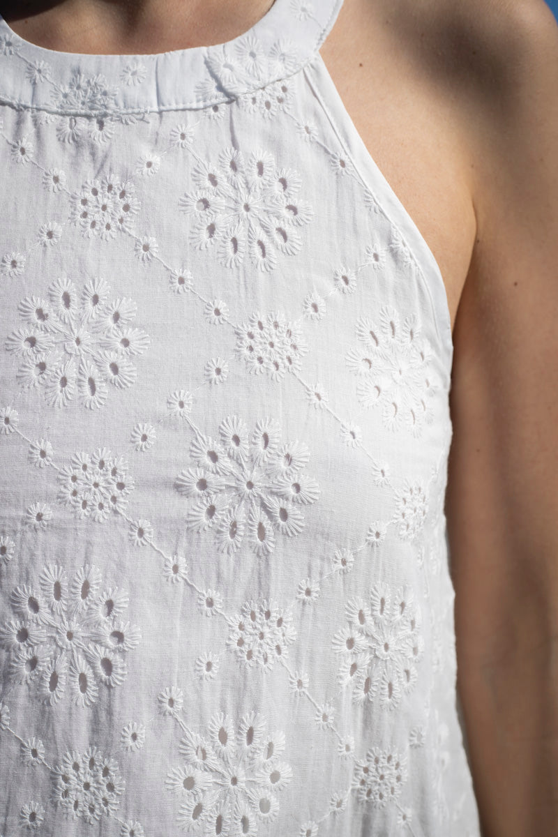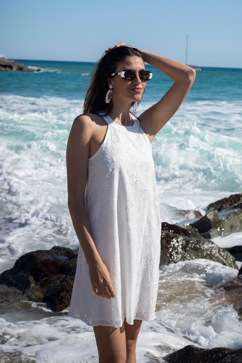 With a very flattering halter neck, the Nairobi dress stands out for its sleeveless design, its white color, and its light silhouette that make it perfect for hot days. It is the dress you need this summer. It adapts to any summer plan, from a casual outing to a more special occasion.