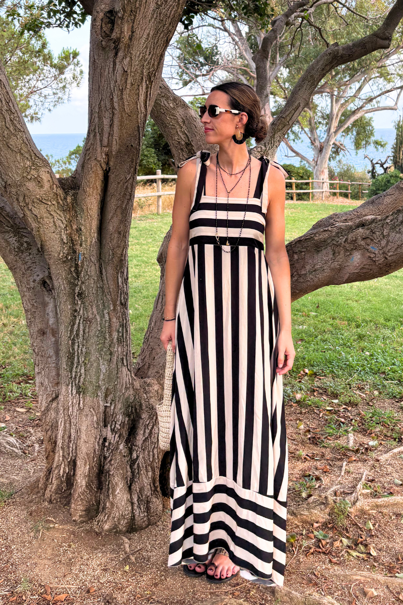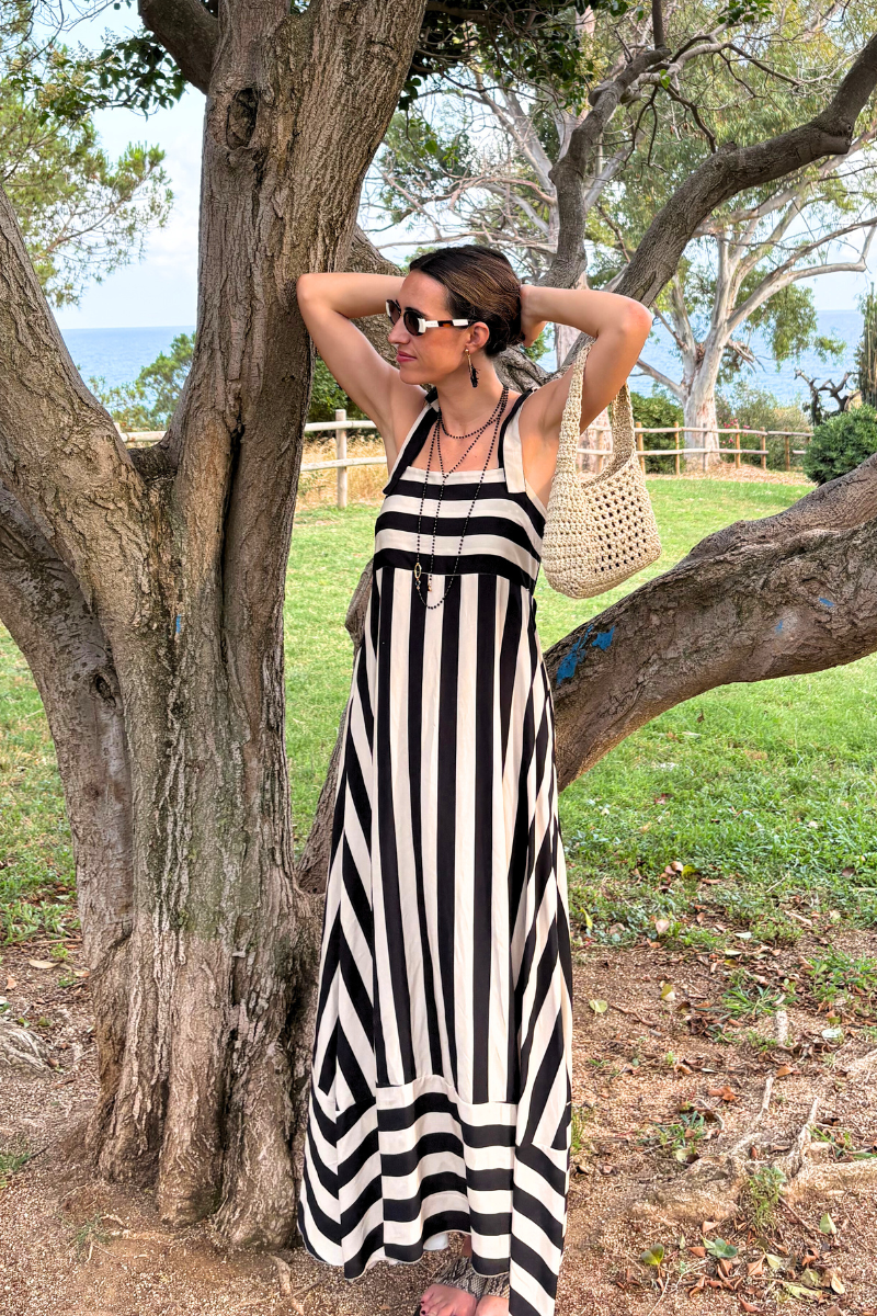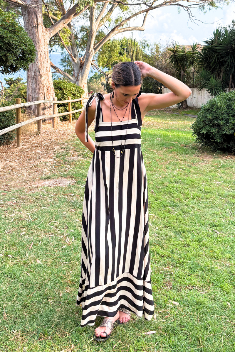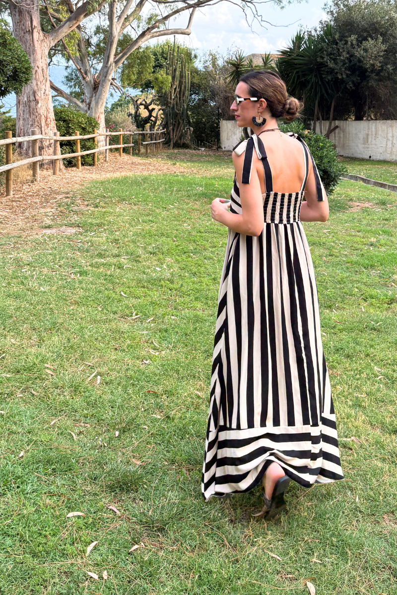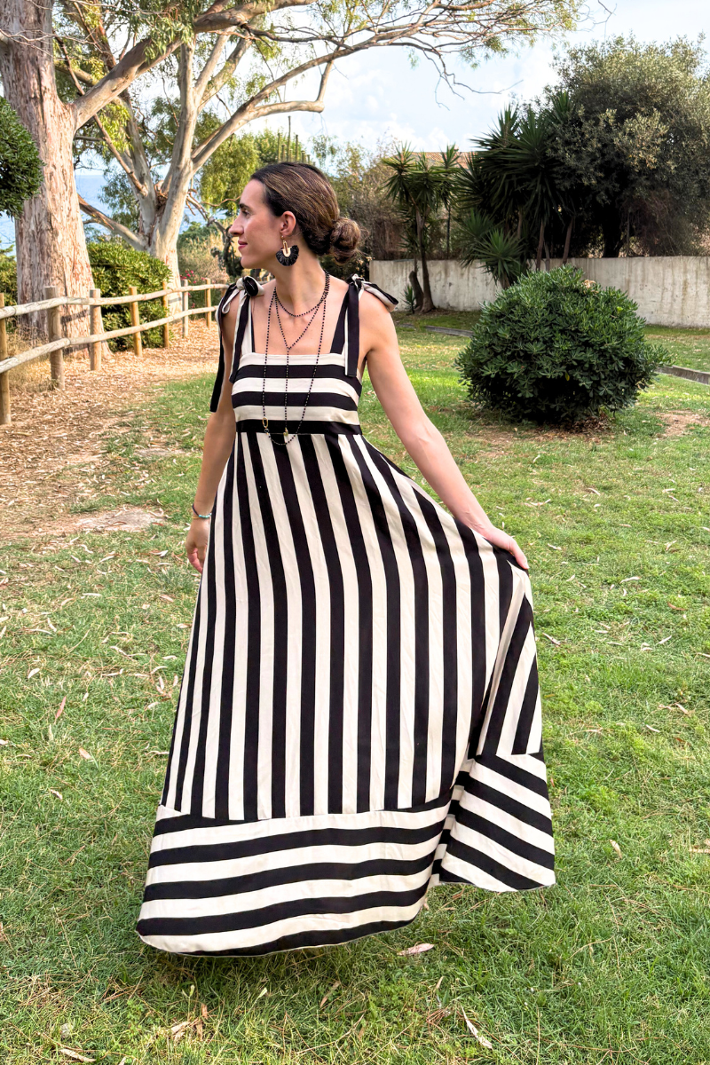 Strap dress with black and white stripes, in a fresh and versatile style. The bows on the straps add a delicate touch without complications. It has a flattering cut that fits well to the body, ideal for different body shapes. The back includes an elastic band that provides fit and comfort, without losing shape. It is a comfortable and easy-to-wear option, perfect for warm days or stylish casual looks.
