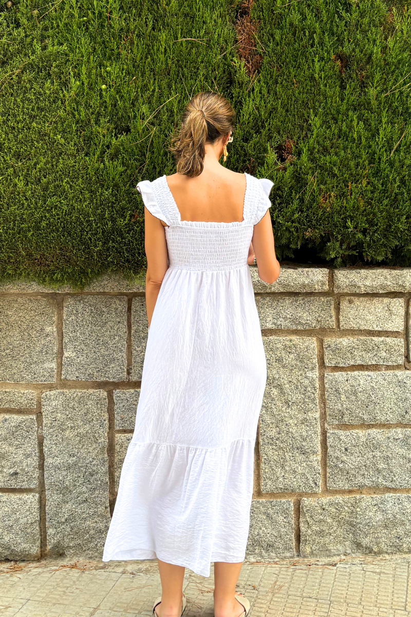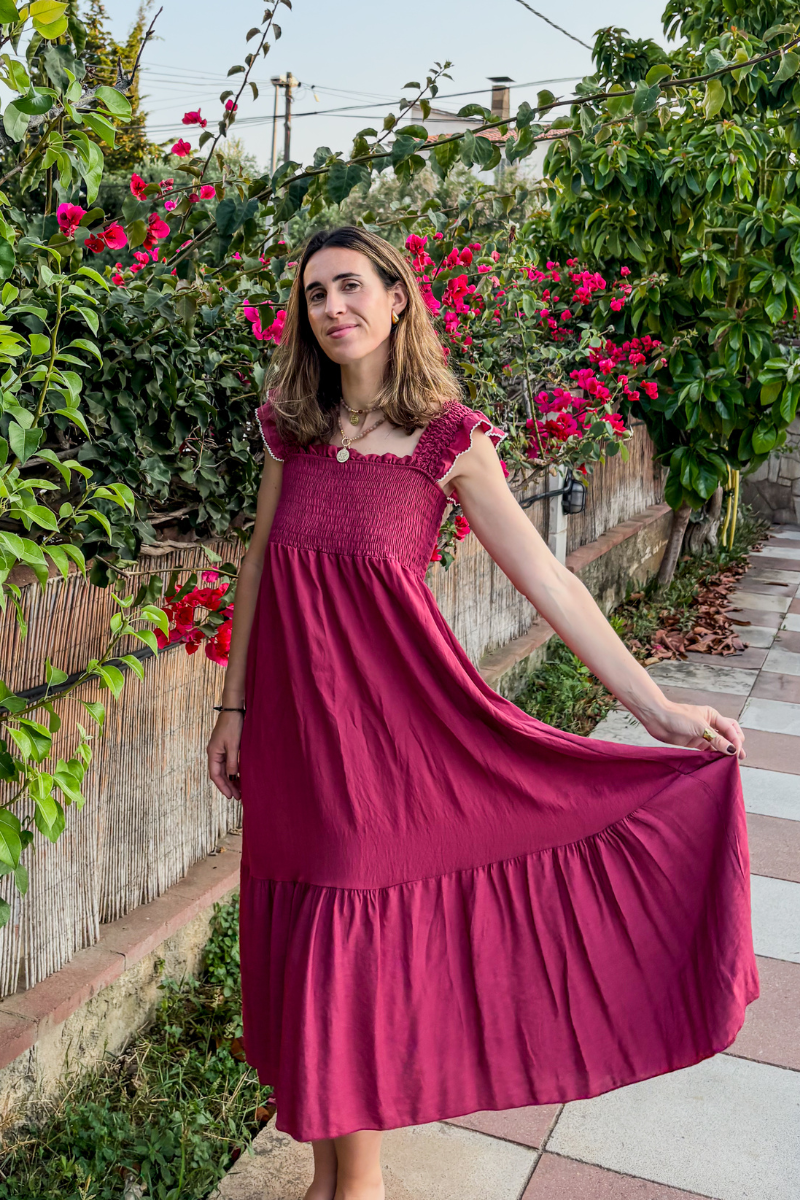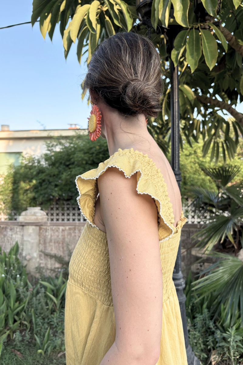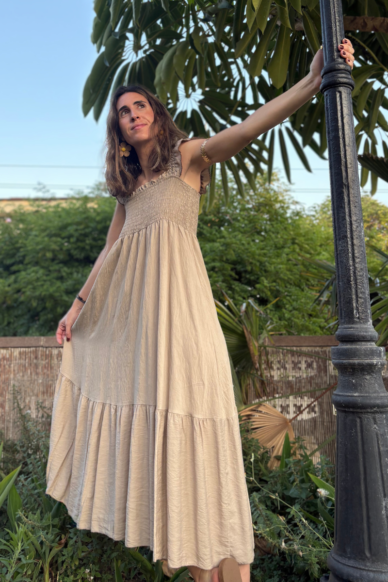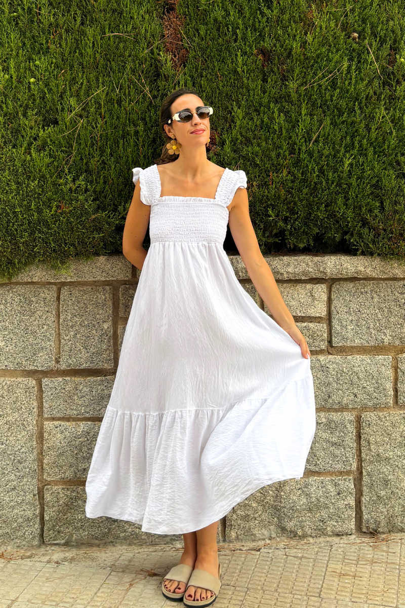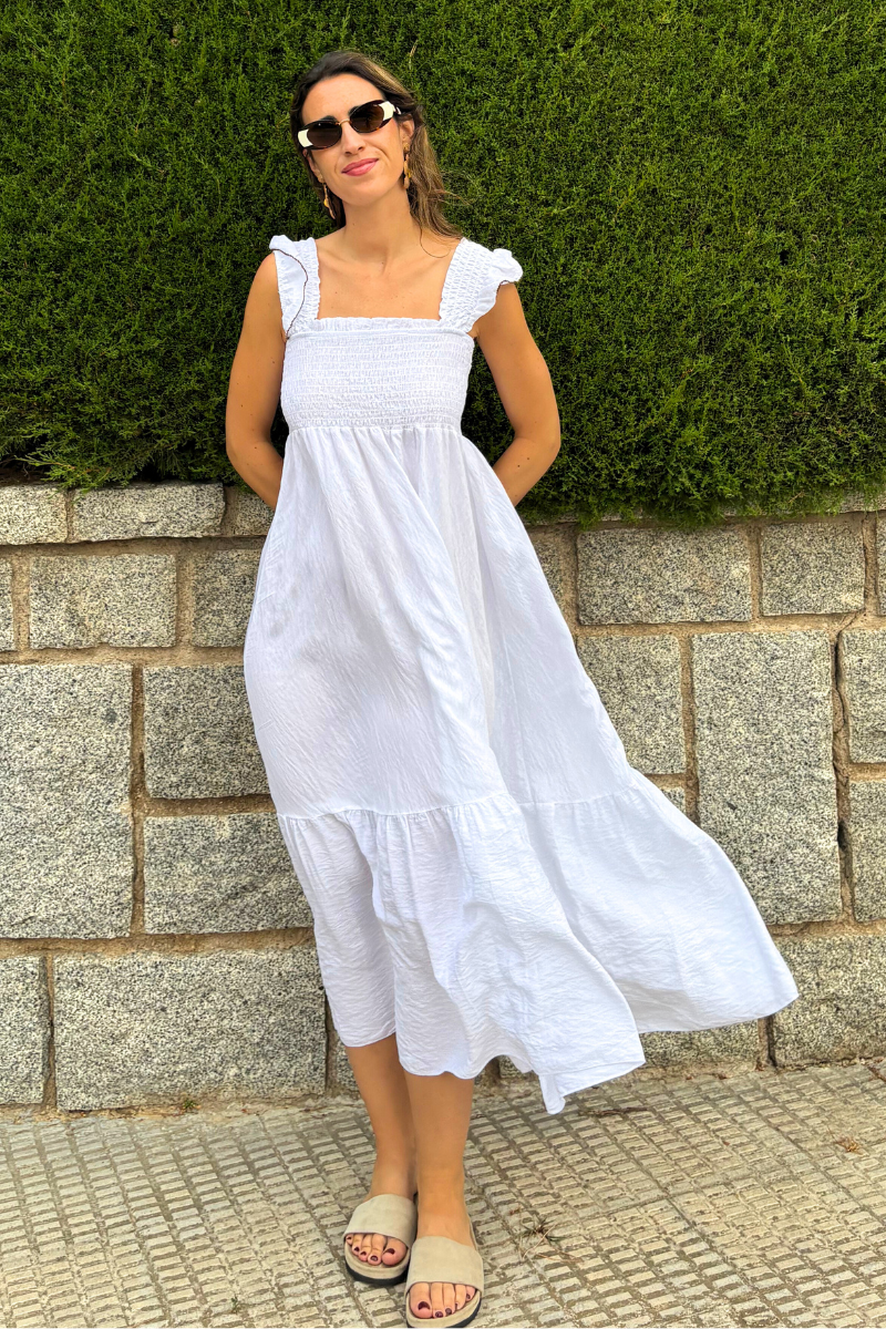 Its top with a honeycomb detail and soft gathering gently fits various body shapes, offering a enveloping and feminine feel. Its fluid and light drape makes it the perfect companion for hot days and all plans.
