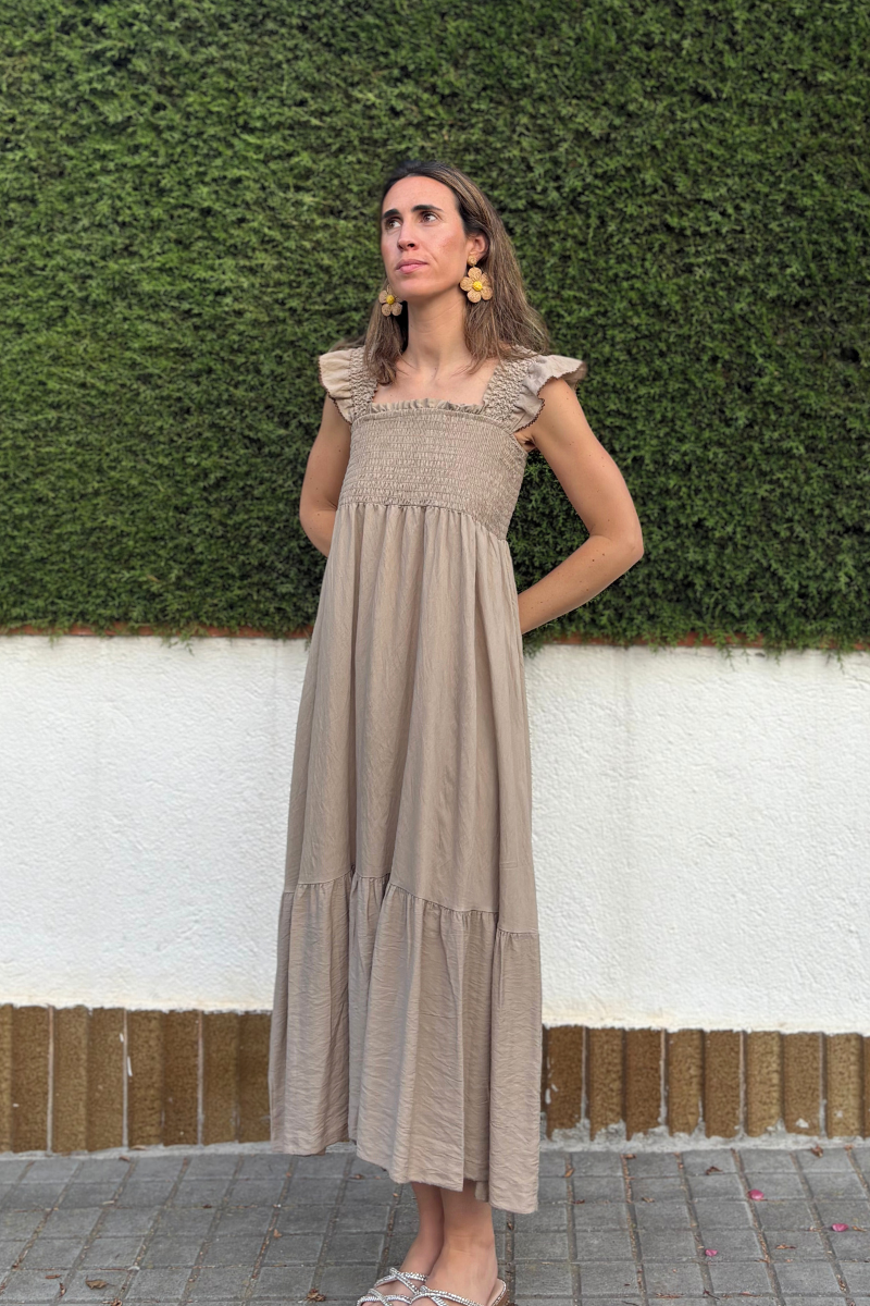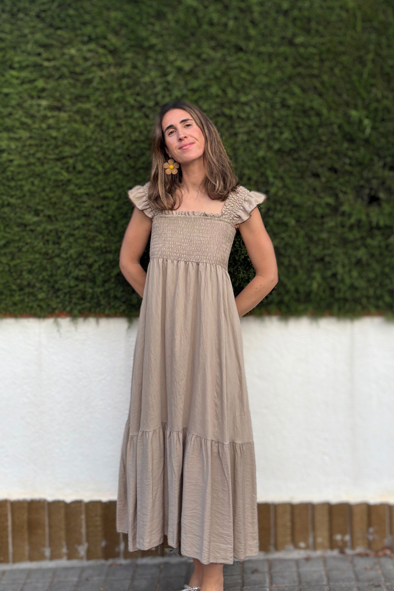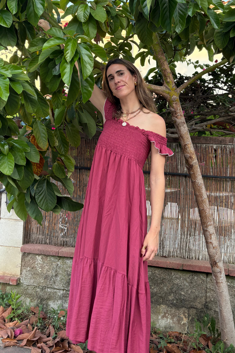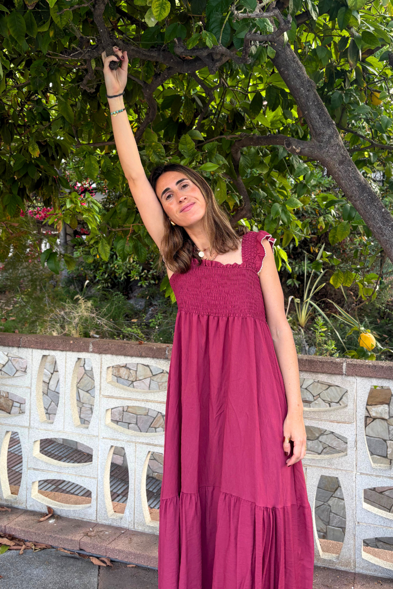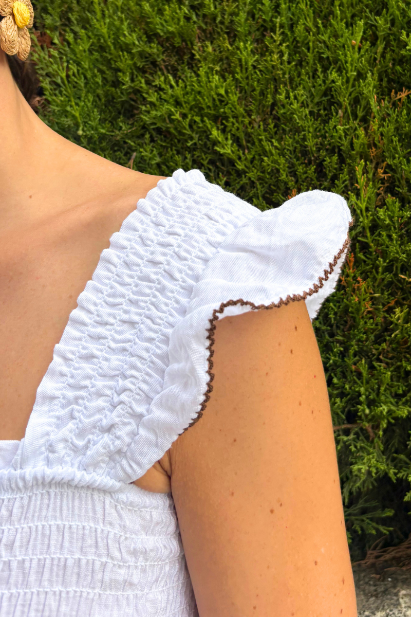 Its top with a honeycomb detail and soft gathering gently fits various body shapes, offering a enveloping and feminine feel. Its fluid and light drape makes it the perfect companion for hot days and all plans.