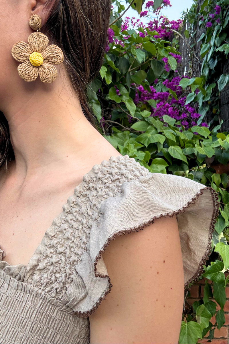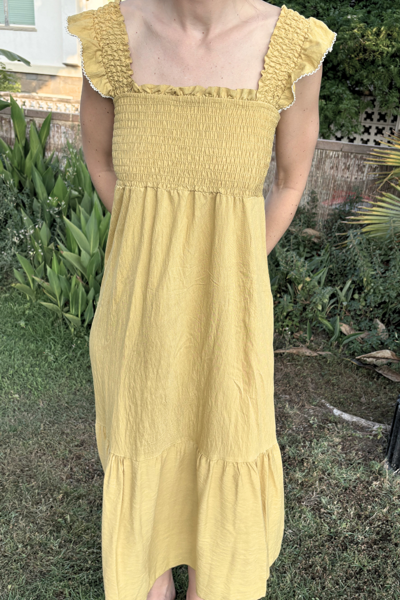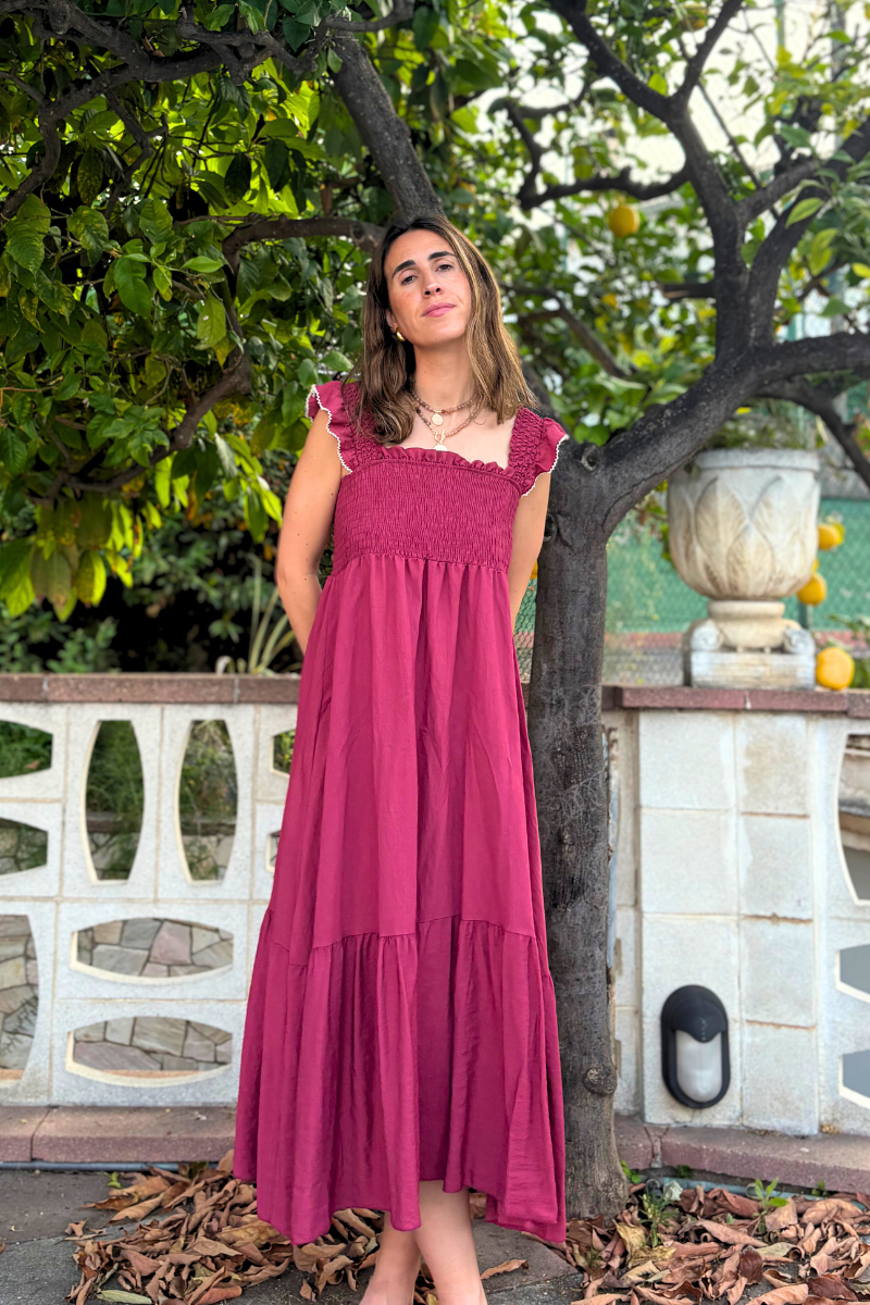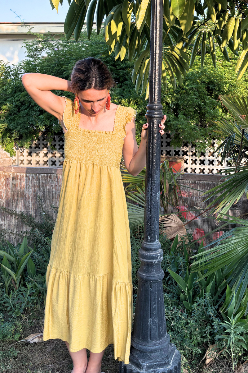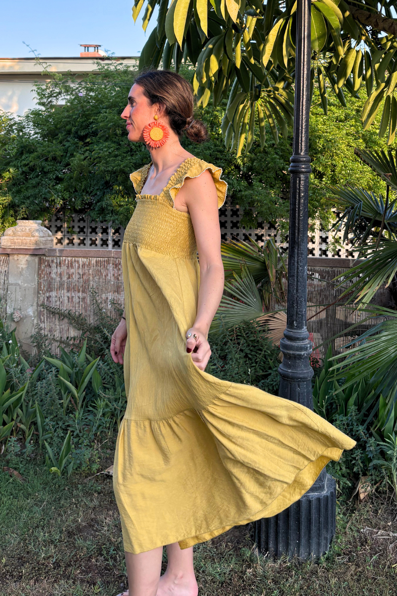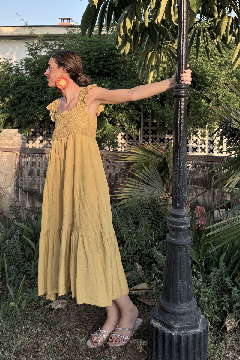 Its top with a honeycomb detail and soft gathering gently fits various body shapes, offering a enveloping and feminine feel. Its fluid and light drape makes it the perfect companion for hot days and all plans.