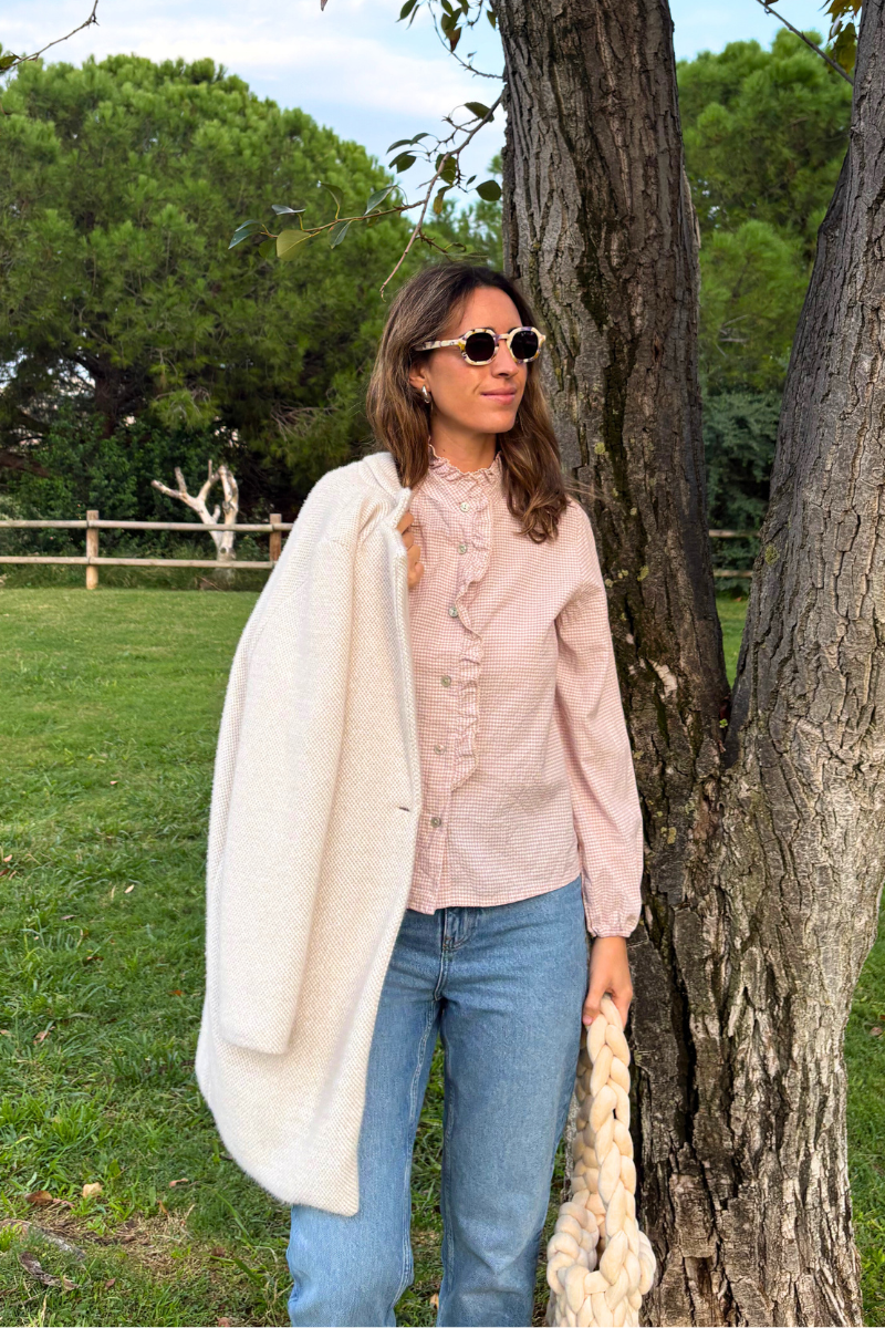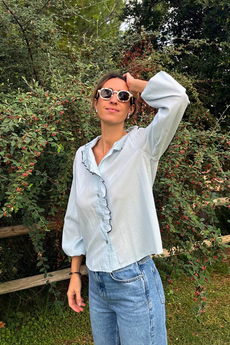 El detalle anudado con botones añade un aire desenfadado y chic, perfecto para combinar con vaqueros, faldas o pantalones. Además, el volante en el cuello enmarca el rostro con un toque femenino y delicado.