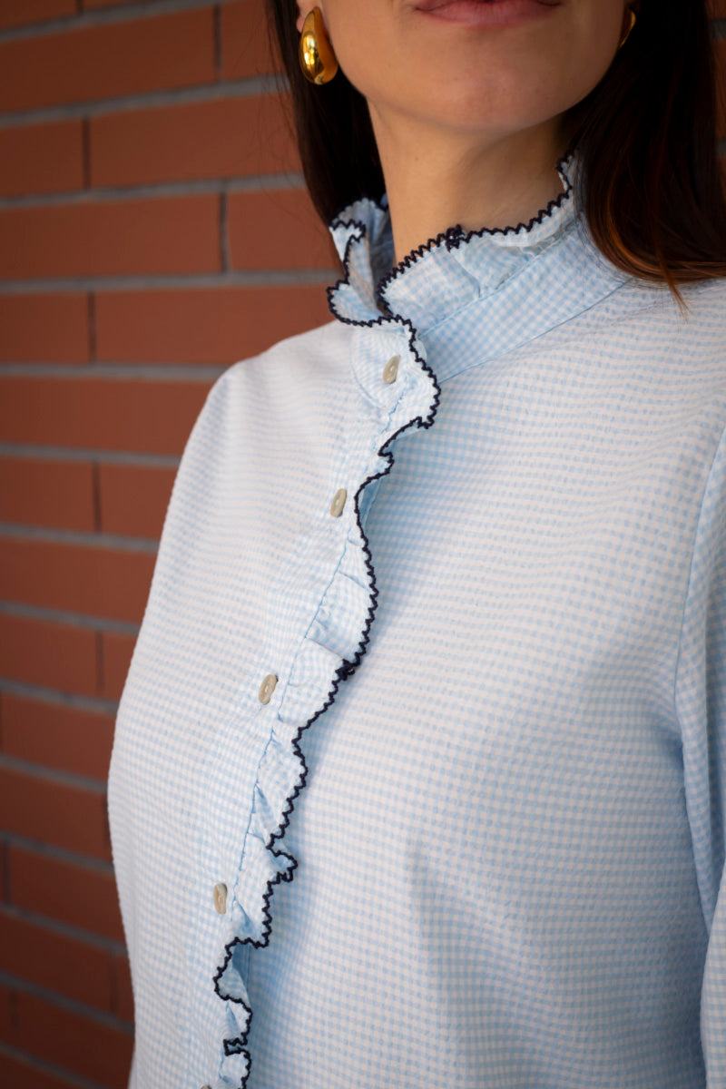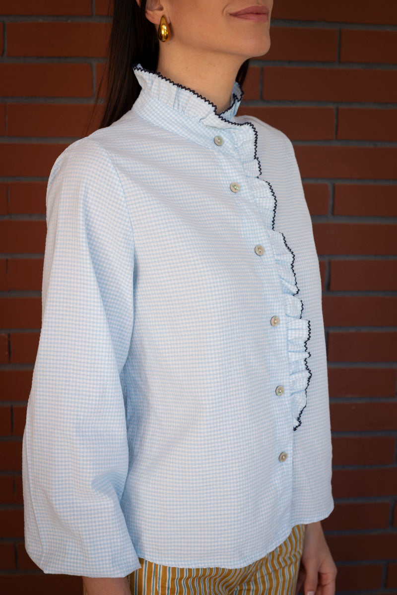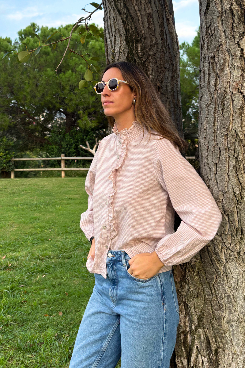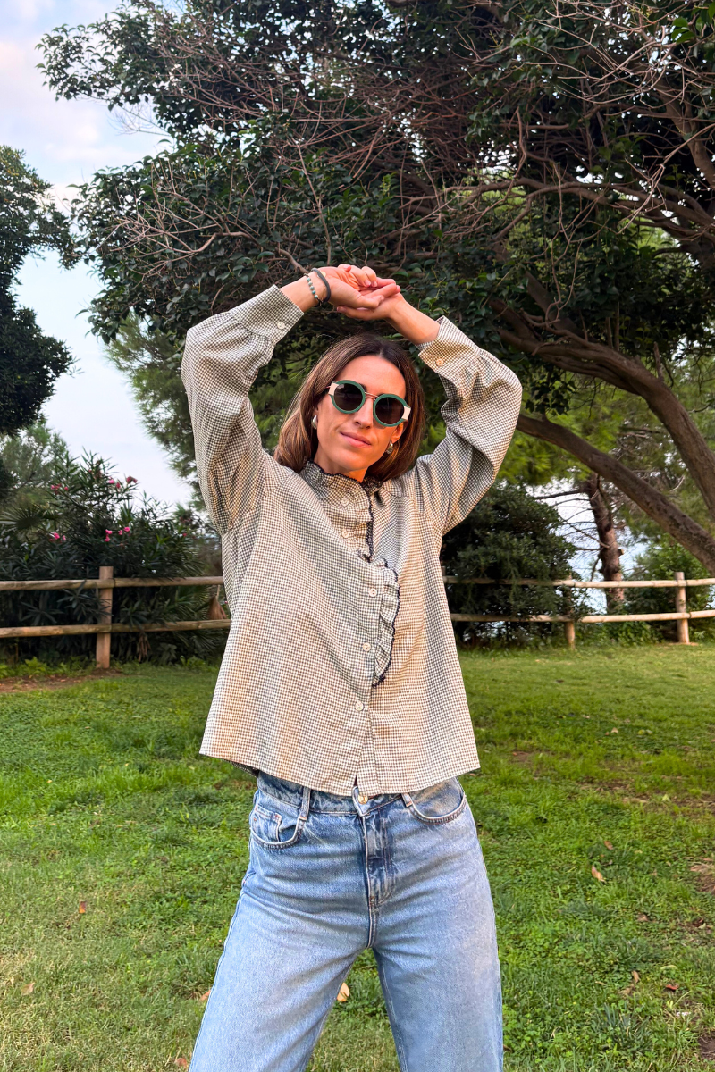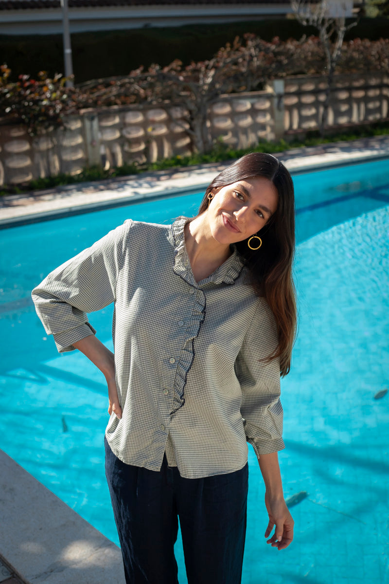 Con un estampado de cuadros atemporal y un favorecedor volante lateral, la camisa Divo es un imprescindible en tu armario.