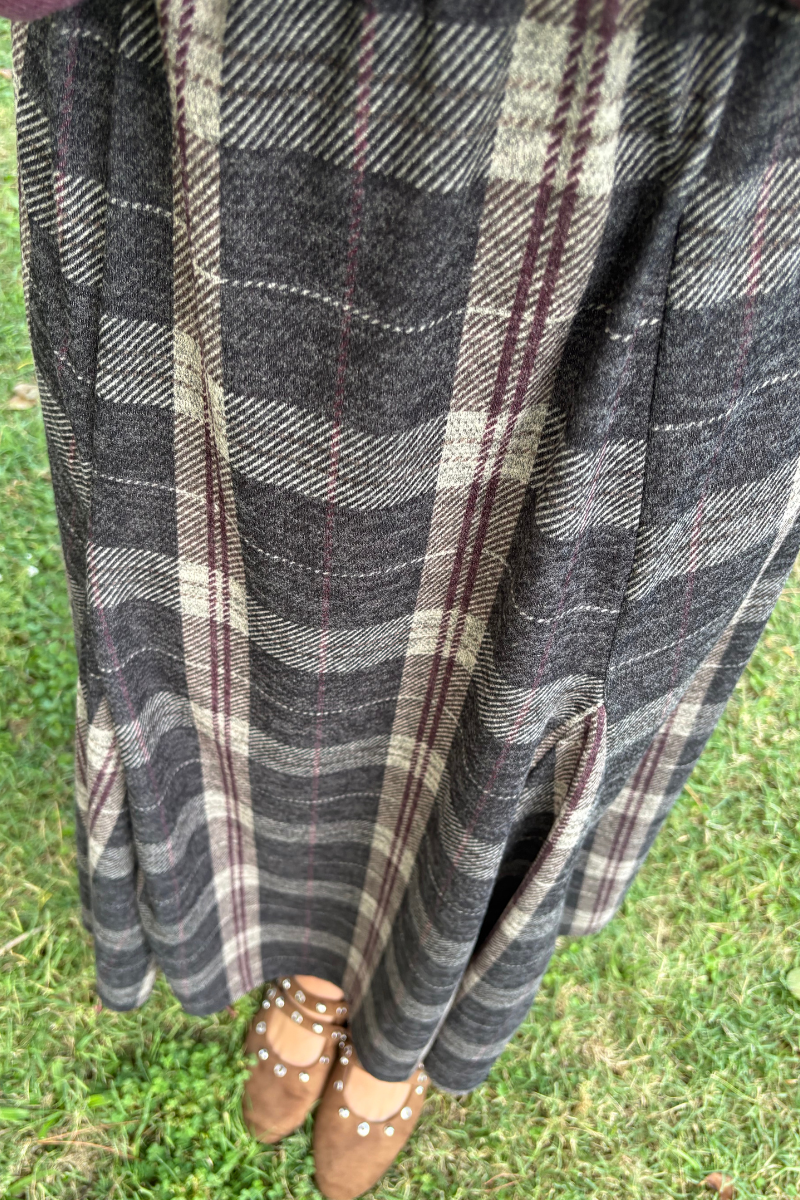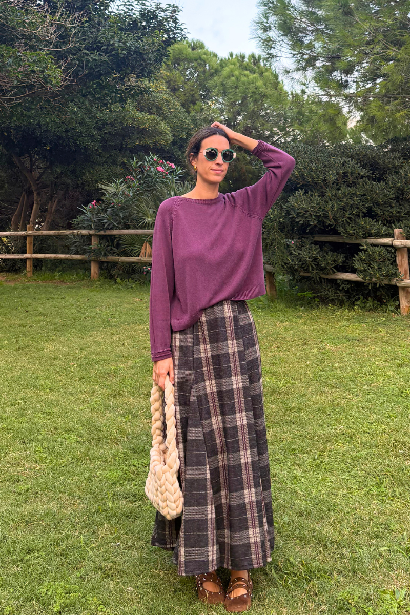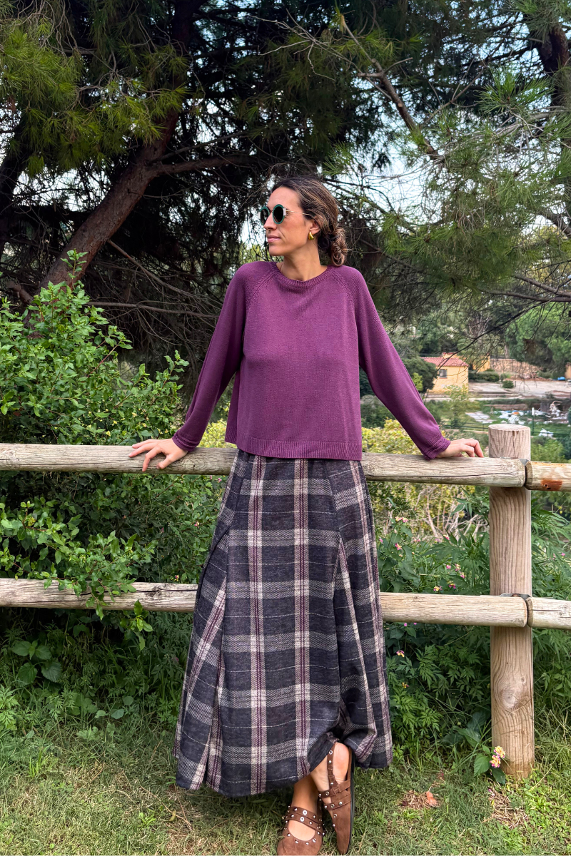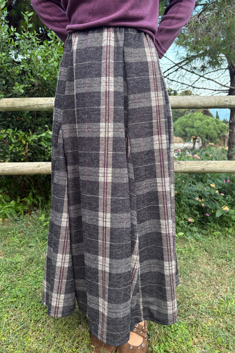 La falda Arusha combina calidez y estilo en una pieza pensada para el día a día de otoño e invierno. Confeccionada en un tejido suave de cuadros en tonos grises y burdeos, aporta textura y un aire elegante sin perder comodidad.