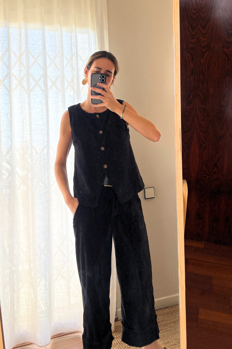 El Pantalón Lamu completa el conjunto junto al chaleco Lamu. Confeccionado en terciopelo, ofrece un tacto suave y un acabado con cuerpo que aporta comodidad y estilo.