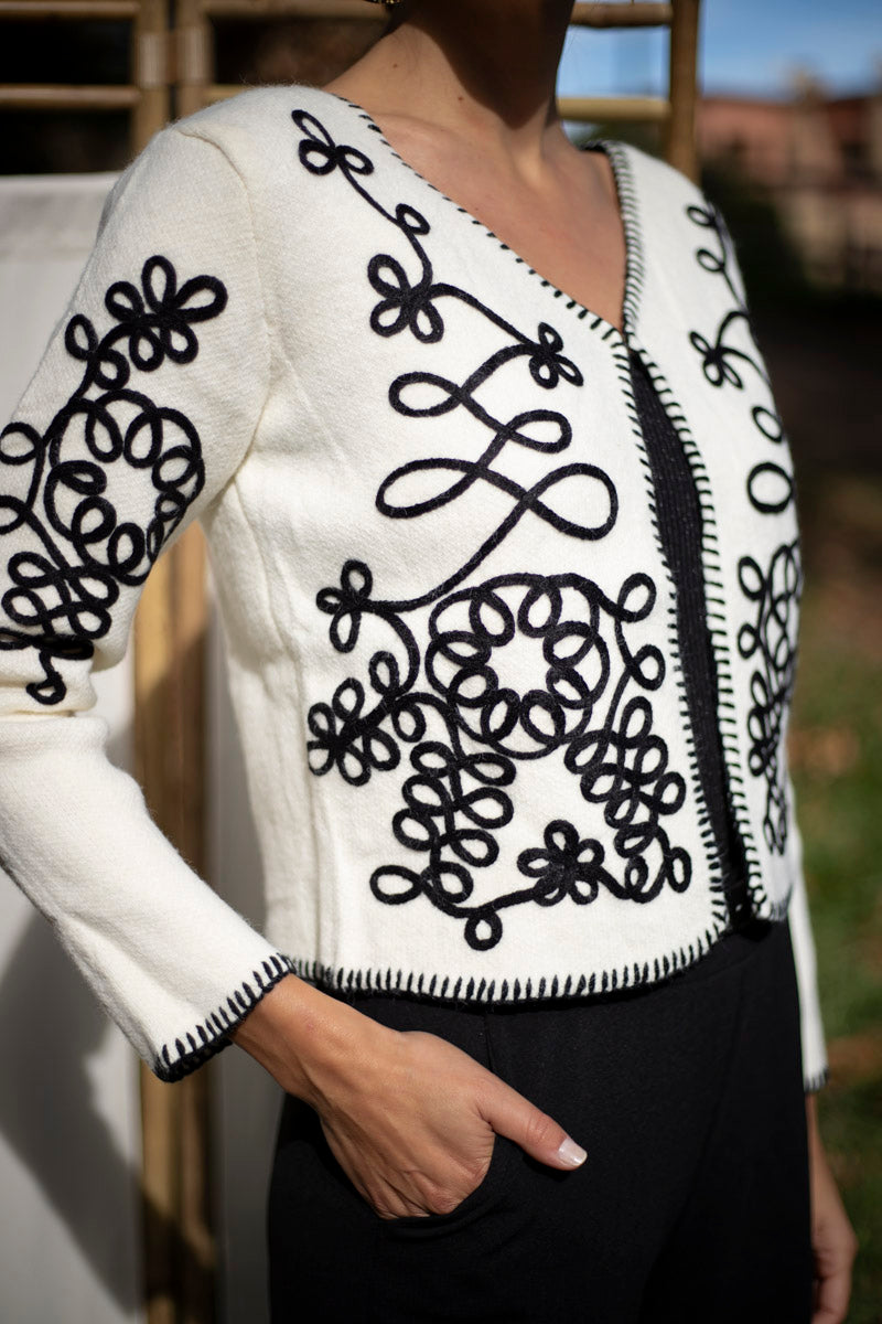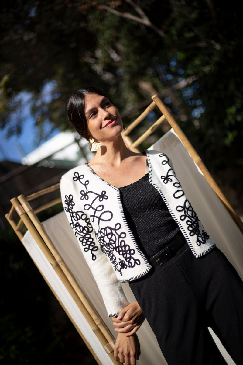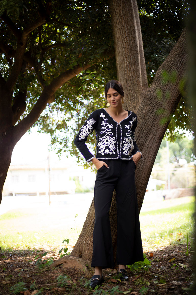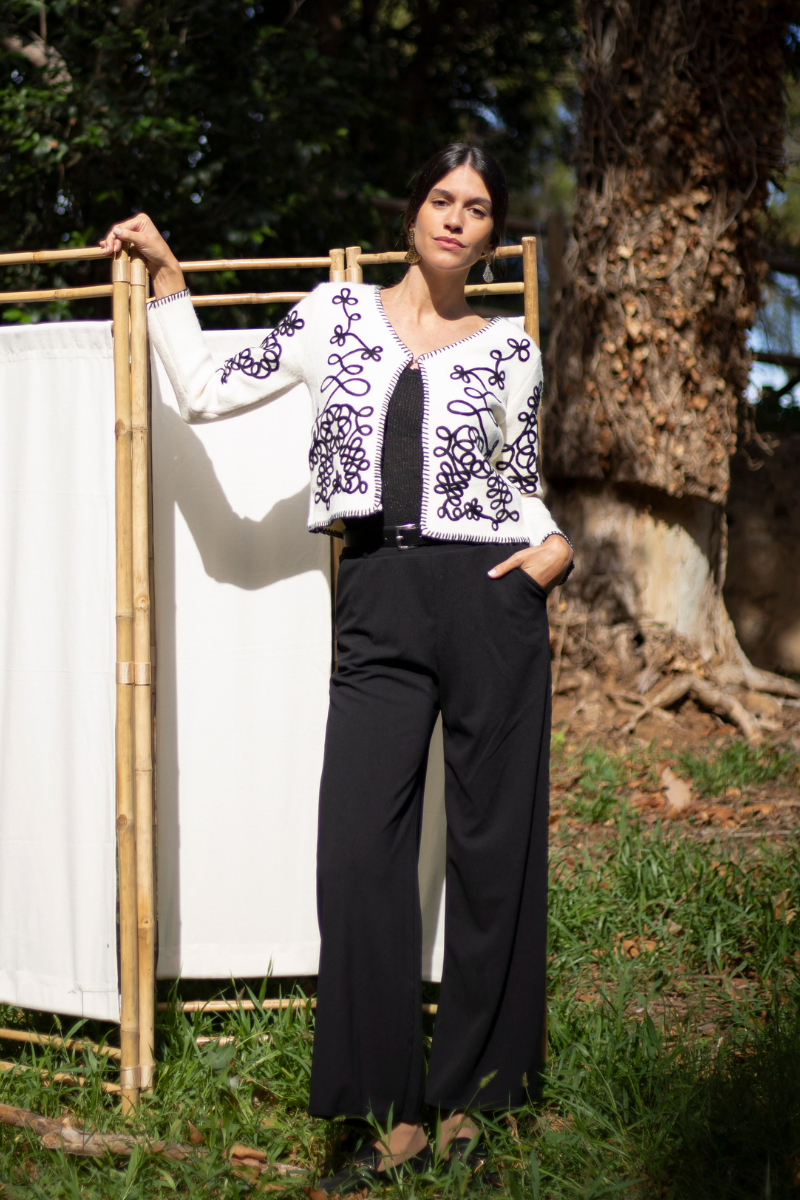 Descubre el conjunto Mila, Montagu y Bejaïa. La chaqueta bordada, suave como una caricia, se combina a la perfección con los pantalones elásticos y el top brillante. Un look versátil para cualquier ocasión, desde la oficina hasta una salida cotidiana.