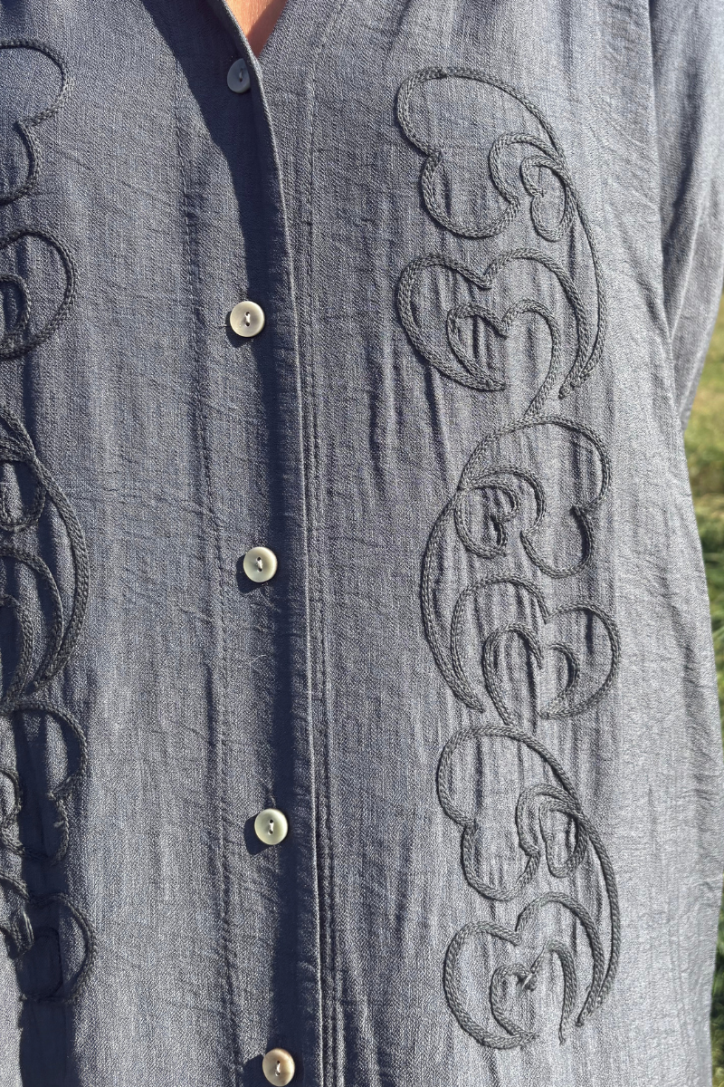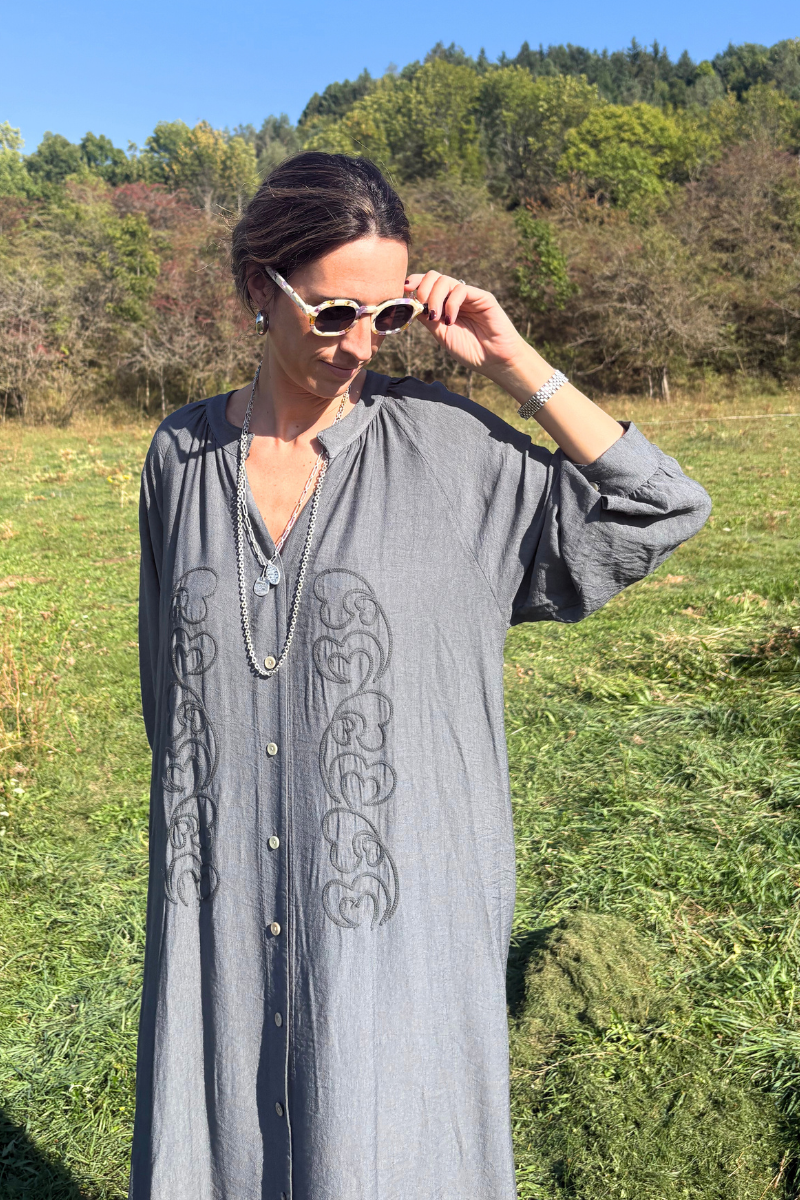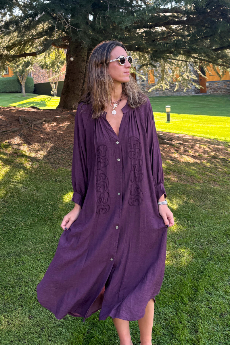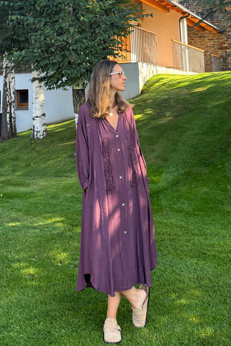Este vestido, diseñado en gris y bugambilia, es perfecto para la temporada de otoño. Su corte fluido permite un movimiento natural y cómodo, adaptándose a distintas siluetas, mientras que su diseño aporta un toque moderno y sofisticado.